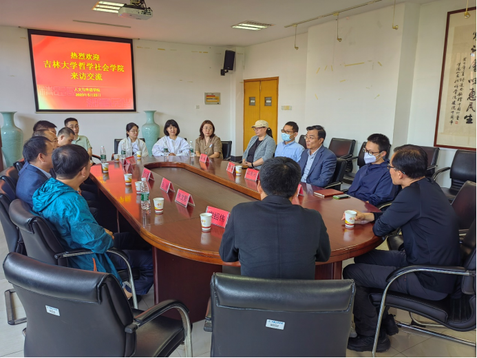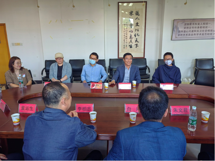 调研工作组一行人。首先,邱教授提到,自己在学院学习和工作的情景仍历历在目,今日看到学院领导和老师倍感亲切,对老师们的到来表示热烈欢迎;接着,邱院长介绍了中国计量大学人文与外语学院的简要情况,结合师资队伍建设和科学研究,双方进行了细致交流;然后,双方就本科生培养模式、研究生招生宣传等人才建设工作展开充分经验交流学习;最后,双方就现有情况共话合作基础与意愿。