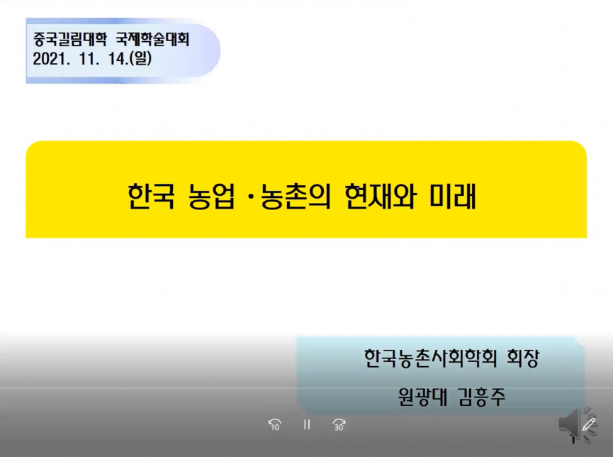 韩国光云大学福利保健系的金洪注教授介绍了韩国农村的现在与未来。当前韩国农村面临农村老龄少子化严重、耕地面积减少、就业劳动力减少、农业法人减少等问题。疫情期间,粮食问题成为一个国家的安全问题。韩国民众愿意通过交税的方式帮助农村发展,因此对未来韩国的农村发展充满希望,有很大的提升空间。