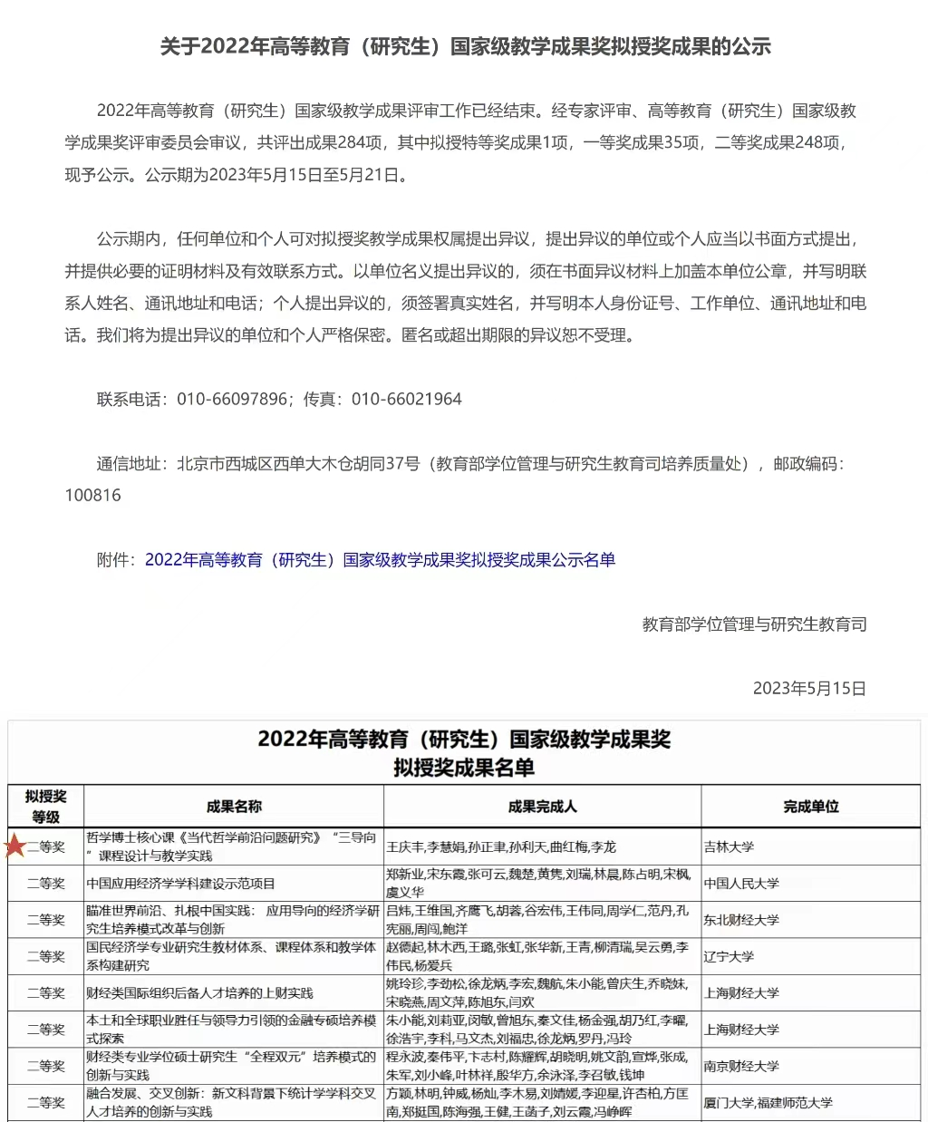 近日,教育部公示2022年高等教育(研究生)国家级教学成果奖拟授奖成果的名单。经专家评审、高等教育(研究生)国家级教学成果奖评审委员会审议,共评出成果284项,其中拟授特等奖成果1项,一等奖成果35项,二等奖成果248项。