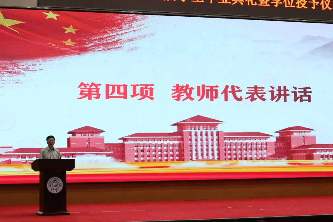 之后,教师代表、哲学系教工党支部书记李聪上台讲话。李聪老师以幽默而睿智的话语对毕业的同学们致以亲切的祝贺。大学之“大”,非大楼之谓、乃大师之谓也。学院的老师们谆谆教诲、言犹在耳,对于“传道授业解惑”做到了身体力行;同学们也在学习的过程中启迪了智慧、增长了见识。期盼毕业的同学们能在以后的学习、工作与生活中继续保持热爱智慧、求真务实、“为人为学、其道一也”的优良品质。我们当为大家加油呐喊!