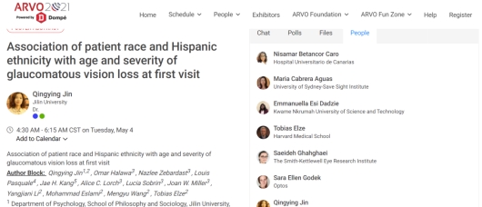 2021年5月1日至7日,由国际视觉与眼科学研究协会举办的2021年大会成功举行。视觉与眼科学研究协会是最权威的国际眼与视觉研究组织,在全球范围内推进科学研究,以充分了解作为人类最重要感觉形式——视觉的结构、功能和机制,预防、治疗和治愈视觉系统疾病。由于新冠疫情的影响,本届年会采取线上会议的方式进行。来自世界70多个国家的视觉科学研究者参加了本次会议,与会者通过访问由Pathable开发的大会专用平台浏览议程,参与大会展示的各项研究,并进行广泛的交流。