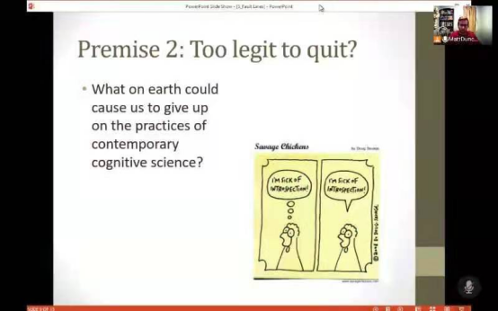第五部分讲授了The fault lines of the debate。这部分Duncan主要讨论了二元论者与许多物理主义者在方法论上的一个重要分歧。一般来说,支持二元论的论点需要诉诸于我们的内省,而支持物理主义的论点常常是第三人称的、实证的主张。二元论者承认内省和实证方法的合法性,但一些物理主义者则质疑诉诸内省的合法性。知识论者Alvin Goldman在他的著作《Science, Publicity, and Consciousness》中提出了诉诸内省是否合法的问题,而且论证了它的合法性。Duncan在此对Goldman的论证进行了清晰、有益的概述与分析。Duncan在讲座的最后引入了一个许多学生特别要求他讨论的话题:关于(视觉)经验的形而上学争论,Duncan介绍并简要评价了朴素实在论、感觉材料理论、内在心智状态观及表征论对这个问题的不同观点。讲座在热烈的讨论中结束。
