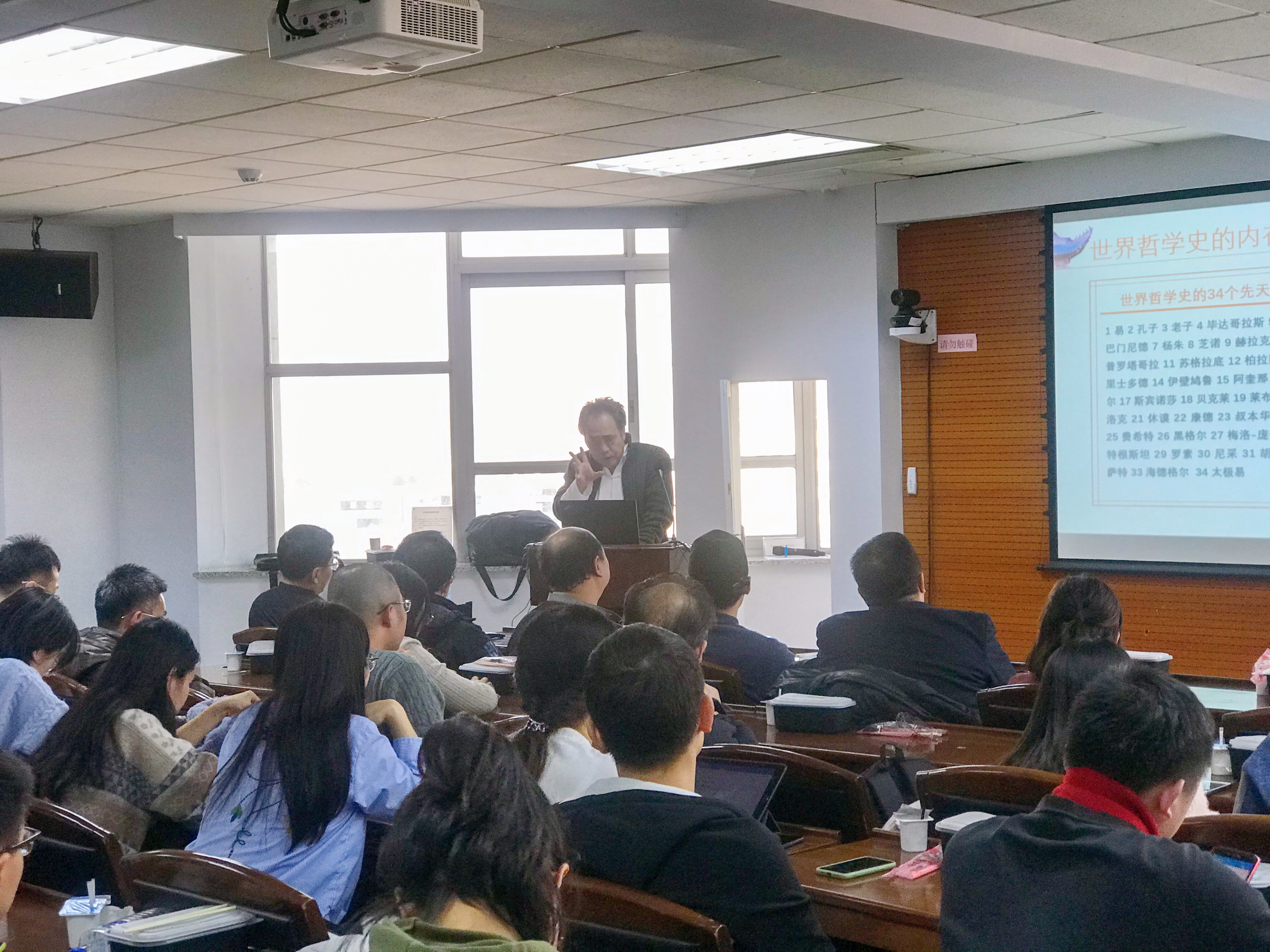 哲学系外国哲学教研室联合马克思主义哲学、中国哲学、伦理学、科学技术哲学教研室举办的“学术月坛”午间座谈会在东荣大厦904会议室举行。外国哲学教研室的龙晶老师以“中西会通的太极之音”为主题,与老师们、同学们交流他在著述70万字巨著《太极之音——中国文化复兴之路》时的思考。座谈会由中哲教研室刘连朋老师主持。共有17位老师和64位研究生(硕士、博士)参加座谈会。副院长芦恒教授参加了座谈会。