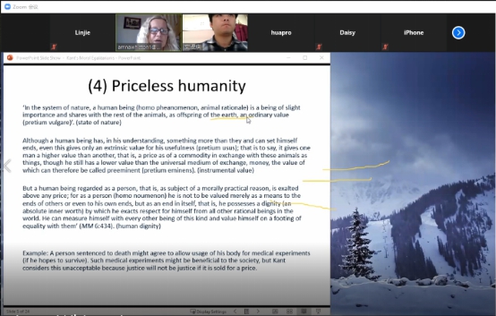 Amna Whiston博士在讲座中主要讲述了作为康德道德哲学核心的“人类尊严”(human dignity)理念。人类尊严,在康德的描述中生发于“自由”(freedom)概念,体现出对社会加于每个人身上的宗教、政治、经济之区分的反抗。康德的伦理学是“属于人民”(of the people)的伦理学,是一种道德平等主义的伦理学。在绝对命令的第二个公式中——“敬重”(respect)是这一理念的典型体现。它不同于“尊荣”(honor)概念,后者无疑是建立在社会角色和层级差异上的。