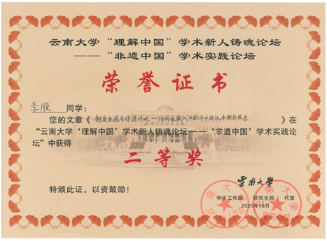 在社会学系刘威教授指导下,李顺同学积极参加该活动,就自己家乡的非物质文化遗产进行了详细调研,并撰写学术论文参赛。他的作品在全国参赛的本科生、硕博士生中脱颖而出,入围10月30日晚的决赛答辩。经现场专家评委们的点评和打分,李顺同学的论文最终荣获全国二等奖。