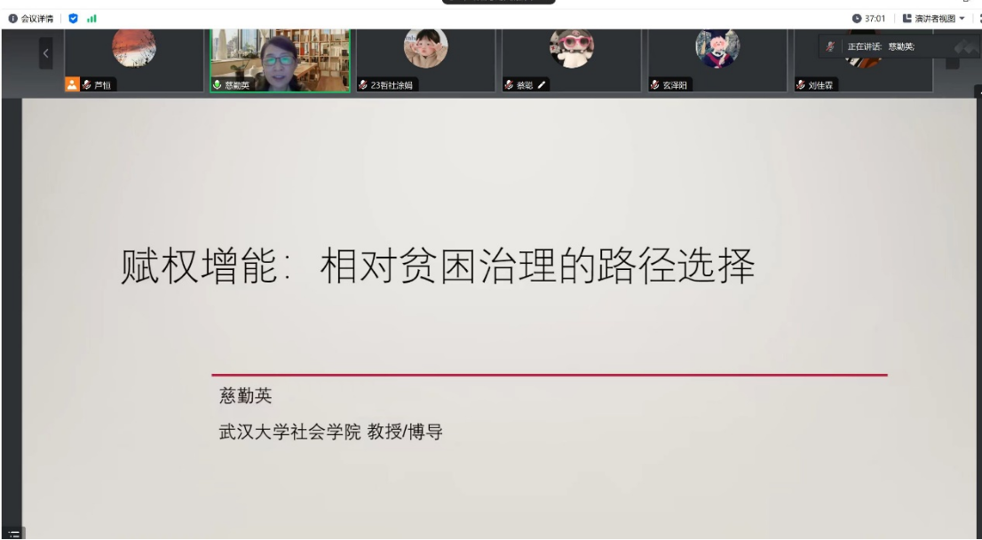 名家系列讲座第204场,题为《赋权增能:相对贫困治理的路径选择》,主讲人为武汉大学社会学院教授,武汉大学珞珈特聘教授,教育部社会工作硕士专业学位教学指导委员会委员,慈勤英教授。主持人为91av