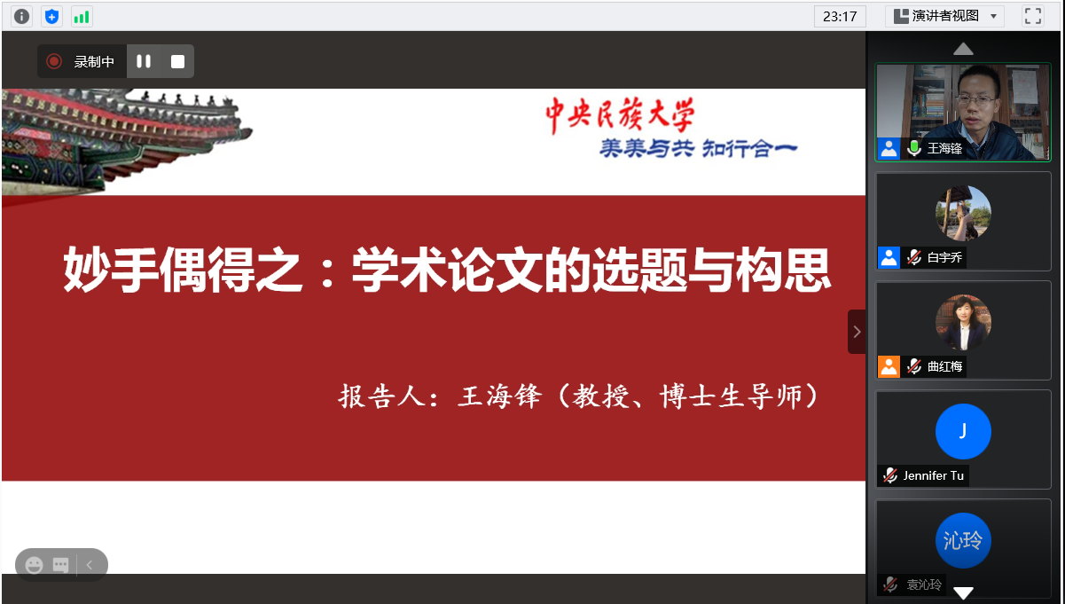 曲红梅教授主持,中央民族大学王海锋教授主讲。讲座的题目为《妙手偶得之:学术论文的选题与构思》。