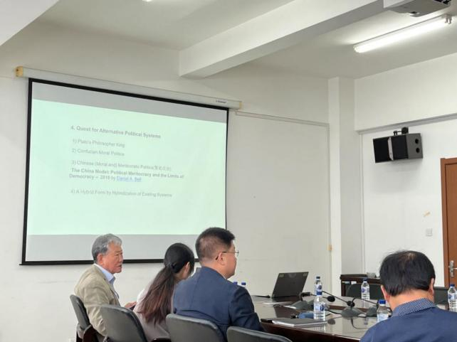 金成国教授的第一场学术讲座题为“The Crisis of Western Electoral Democracy: Toward a Moral and Meritocratic Democracy”。他从理论演化的脉络中进行了东西方的文化交流与差异分析,指出西方选举民主的衰退趋势,并分析了西方社会存在的各种具体现象和问题。