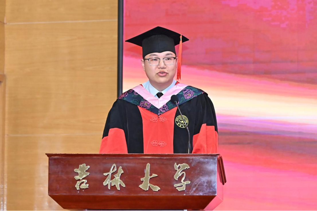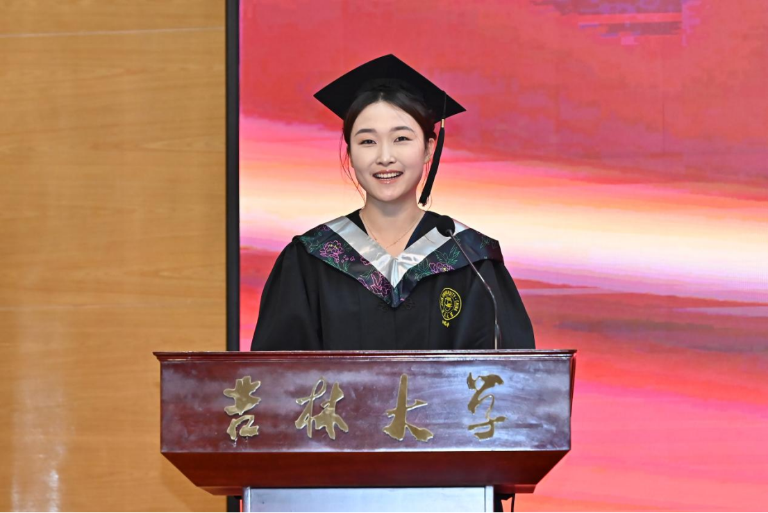 十佳大学生、最美女大学生获得者,2020级劳动与社会保障专业李慧婷发言。她向曾经一路相伴成长、相向奔赴的师长们、亲友们,表达了最真诚的谢意,并回顾了自身沿着初入吉大的旅途一路走来的点点滴滴。她提到,正是学院“为人为学,其道一也”的思想精神、“人比山高,脚比路长”的具体践行浸润了我们的心灵、成就了我们的品格。哲社是每一个你我,哲社成就了我们,我们也共同成为了哲社,无论以后身处何方,愿同学们一起携手努力把“91av