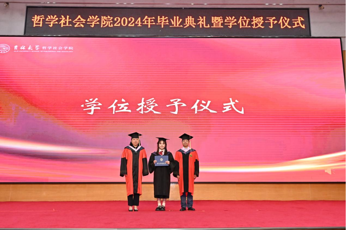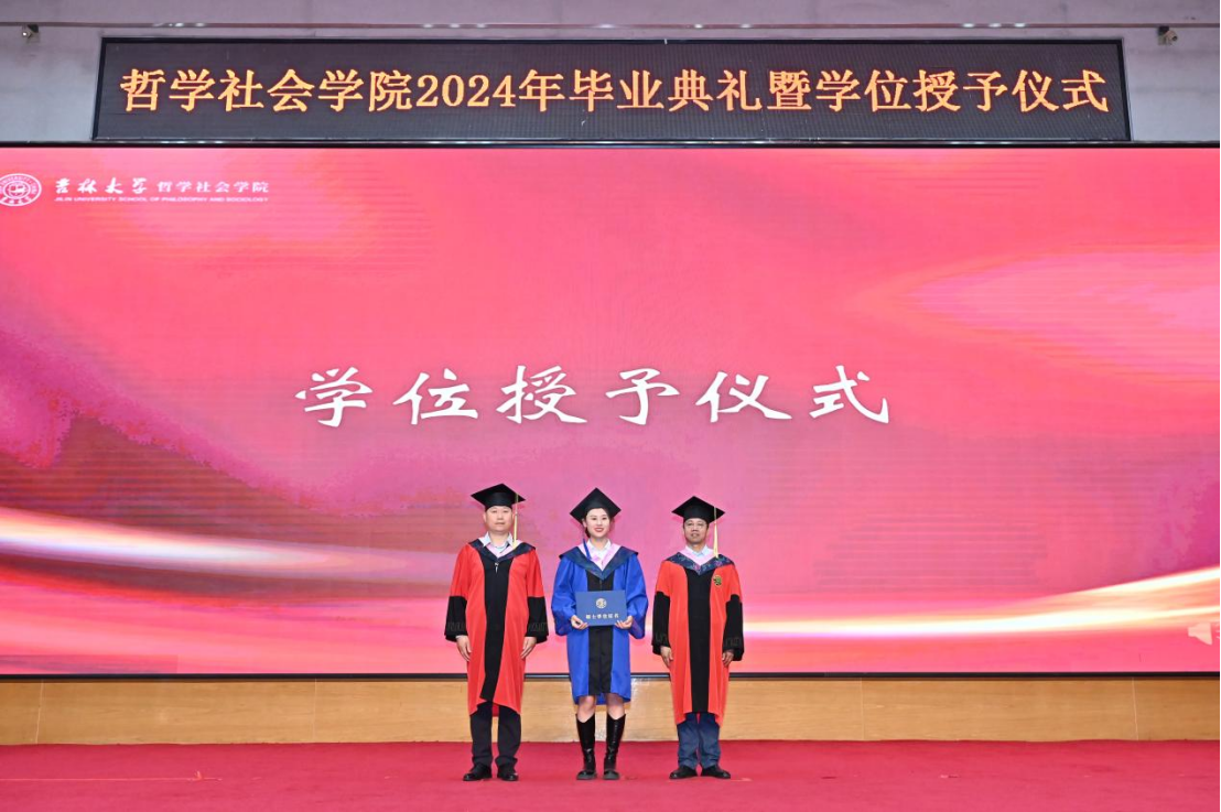 典礼第三项,党委副书记、纪委书记赵洁,基础理论研究中心副主任李生琦为研究生优秀毕业生颁发证书;副院长朱文君,副院长李龙为本科生优秀毕业生颁发证书。主席台上,学院老师们与同学们握手合照,手与手之间的相握,不仅是知识技能的传递,更象征着哲社优秀学术传统与思想精神的代际传承,如今又一届哲社学子将接过时代使命的“接力棒”、踏上求真寻道的“长征路”,愿他们能将哲社精神融入思想与实践之中,汲取力量、砥砺前行!