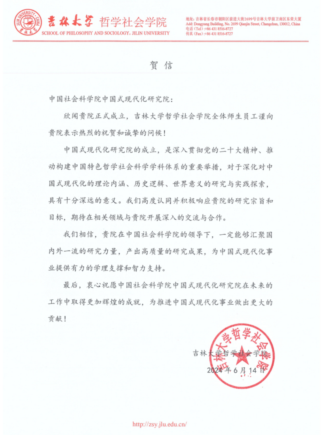 、东北振兴发展研究院以及东亚社会学会对中国式现代化研究院成立分别发贺信祝贺 ,预祝中国式现代化研究院继续发挥理论研究、实践探索、人才培养等方面的积极作用,为中国式现代化的全面推进和中华民族的伟大复兴贡献力量。
