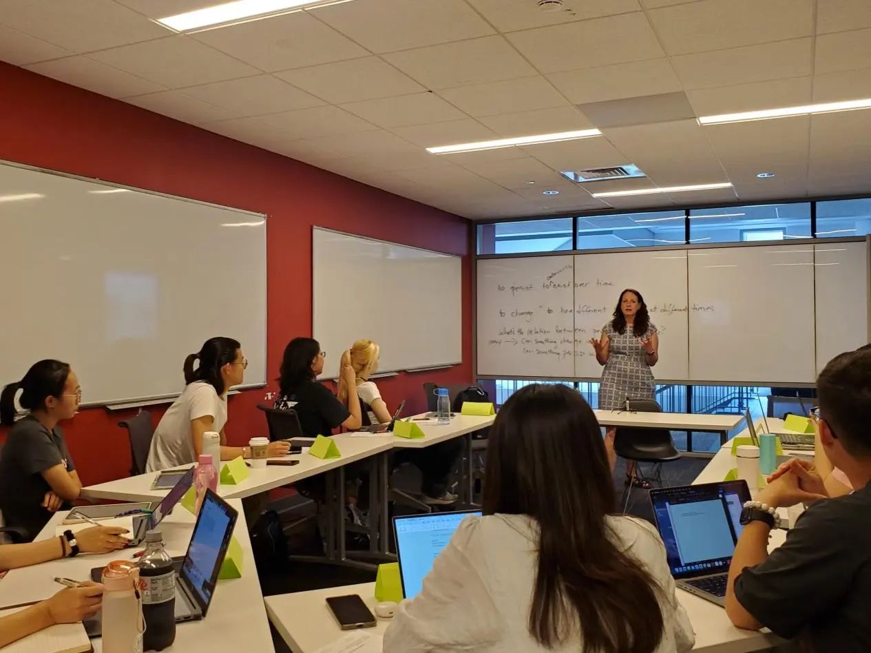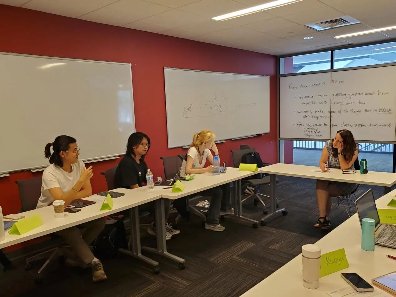 下午,Karen Bennett教授为同学们做了题为“在时间中持存(Persistence Through Time)”的讲座。通过对“Metaphysics”的探讨,教授循序渐进地引导同学们思考“持存”与“变化”的关系,并区分了两个问题——“变化”的局限性与“持续存在”的内在机制。为了探究时间的本性,Bennett教授将传统的三维时间观与四维时间观进行对比,详细讲解了四维时间观对“模糊性”的包容何以解决哲学史上诸如“忒休斯之船”的一系列悖论。根据同学们提出的问题,教授引申讨论了决定论与自由意志的关系问题、四维时间观对于“未来”的两种观点,以及我们应该如何看待四维时间观哲学设想下世界的模糊性。在这场关于“存在”与“时间”的哲学头脑风暴中,同学们收获颇丰。