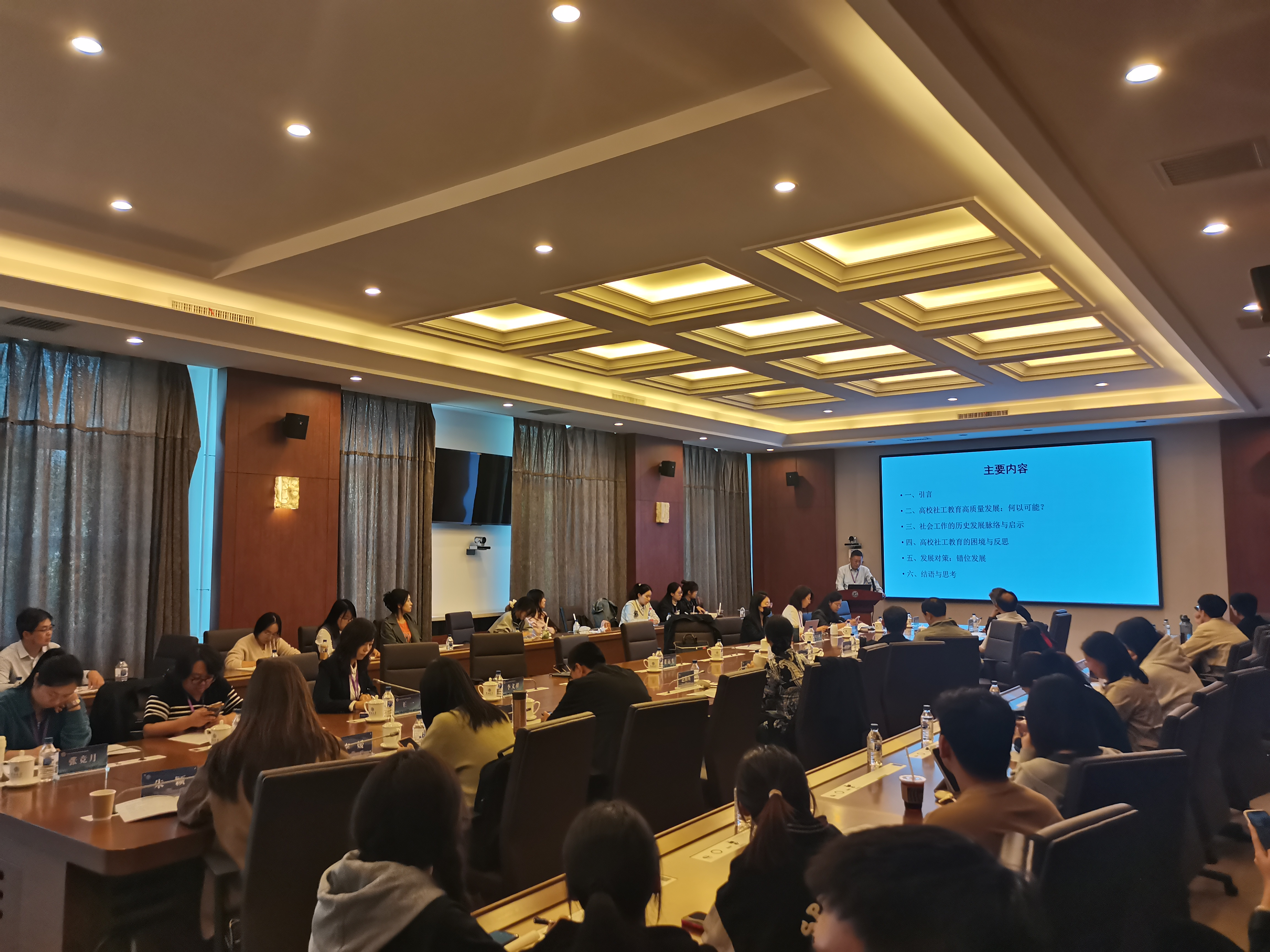 社会学系吴海琳教授主持。中国社会工作学会秘书长邹学银发言题目为《深入贯彻三中全会精神,加强社会工作者队伍建设》,他指出中央社会工作部的职能体现了整体性和协同性,强调要将健全社会工作体制机制作为社会工作队伍建设的重点任务。贵州大学公共管理学院党委书记庄勇教授发言题目为《“两个结合”与中国社会工作自主理论的建构》,强调社会工作理论要讲场景,要与实际情况相结合,并提出了加强社会工作理论框架的系统化建构的发展方向。中国青年政治学院社会工作系陈树强教授发言题目为《推动社会工作高质量发展的途径》,认为社会工作高质量发展是对经济社会发展方方面面的总要求的回应,要始终坚持“以人民为中心”,回应“本土人民的需要”,积极为社会建设作出贡献。中山大学社会学与人类学学院副院长梁玉成教授发言题目为《基于大模型的社会工作学科知识生产研究》,他使用GPTs分析了近五年的社会工作期刊论文和社会工作硕士(MSW)毕业论文,揭示社会工作知识生产过程中出现的转向。