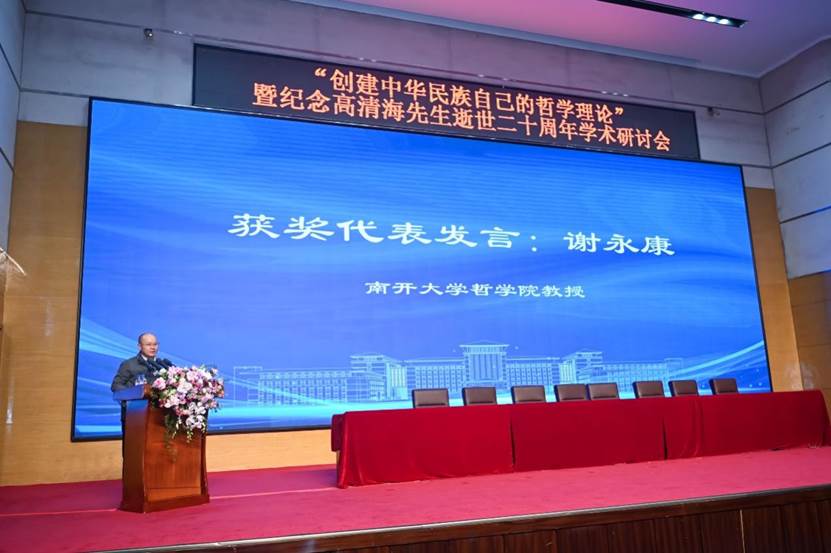 教授张金荣作为颁奖嘉宾,为获奖代表颁奖。南开大学哲学院教授谢永康作为获奖代表发言。谢永康首先表达了对高清海学术基金会的感谢,并介绍了其获奖作品与高清海哲学精神的内在关联。谢永康强调,一个时代的哲学理论不仅要抓住时代的时代精神,还要从古今中西的理论和精神资源当中吸取有用的精华。哲学的基础理论不仅是哲学当中最为基础与精华的部分,同时也可以认为哲学的基础理论就是哲学本身。