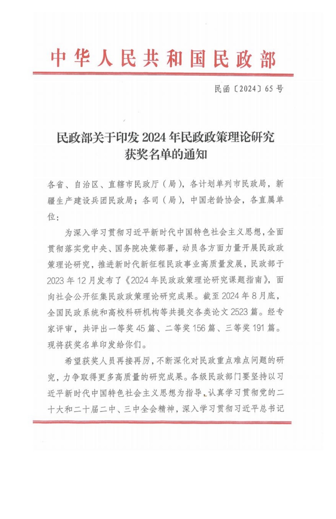为深入学习贯彻习近平新时代中国特色社会主义思想,全面贯彻落实党中央、国务院决策部署,动员各方面力量开展民政政策理论研究,推进新时代新征程民政事业高质量发展,民政部于2023年12月发布了《2024年民政政策理论研究课题指南》,面向社会公开征集民政政策理论研究成果。本院学生积极参与此次活动。2024年11月1日,中华人民共和国民政部发布了关于印发2024年民政政策力量研究获奖名单的通知,91av