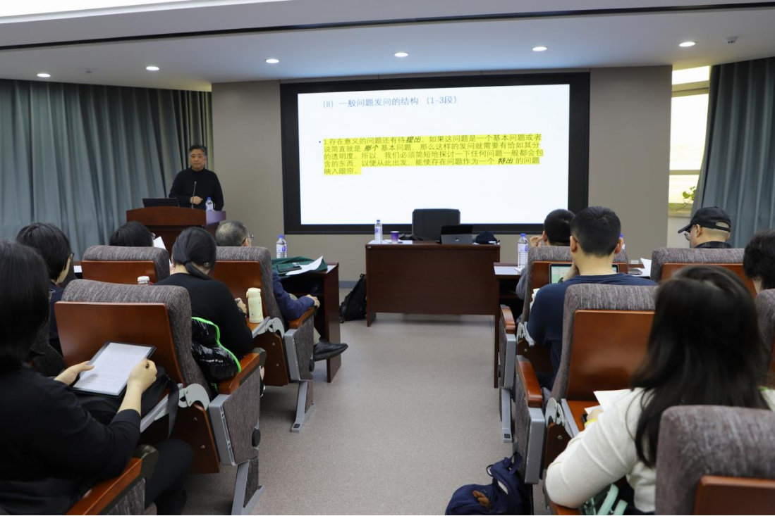 王庆节教授就《存在与时间》第二节“‘存在问题’发问的结构和要素”“‘存在问题’作为特出问题的结构及其要素特点”“‘存在’与‘亲在’之间必然会发生的‘解释学循环’”三大主题进行分享探讨,将个人对海德格尔哲学的思想把握与原著文本相结合,带领师生们对全书第二节进行逐字逐句的深入解读和详细阐释。