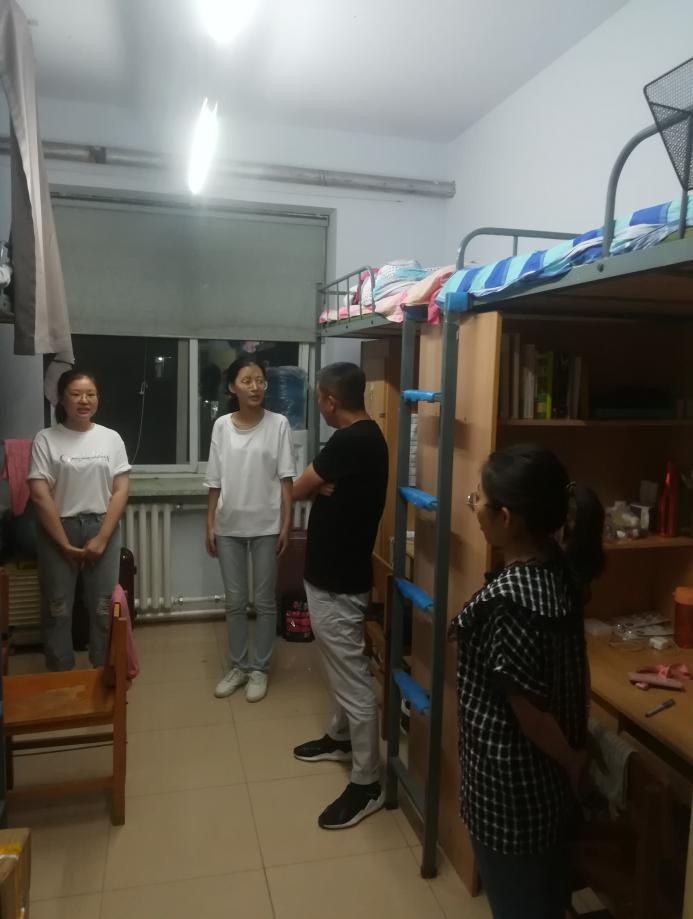(图为领导、老师走访南苑五公寓新生寝室 摄影:郭天竹)