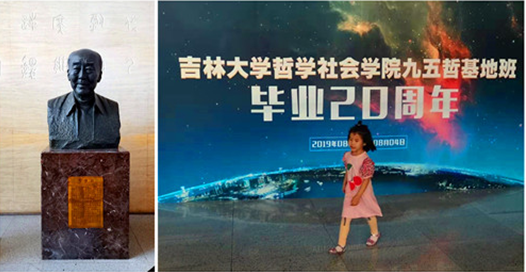 在教学楼里,我们集体在高清海老师雕像前三鞠躬,老去的是老师曾经谆谆教导我们的身影,不曾老去的是我们对老师永远的尊敬和对学院为我们第一批哲学基地配备最好师资的感恩。感恩所有为我们“传道受业解惑”的人师,向我们哲学智慧的启蒙人致敬!我们又去看望了当年英姿勃发地给我们讲《哲学通论》课的孙正聿老师。孙老师老去的是年龄,不曾老去的是“得天下英才教育之”的英气。20年前他还是正值壮年,20年后他已是智慧老人,著书写书教书育人。孙老师赠送我们他的著作《马克思与我们》并给我们签名,望着老师花白的头发,我们静默无言。