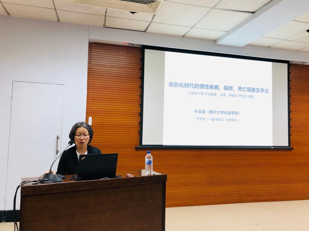 第54场学术名家讲座在东荣大厦9楼904会议室举行。韩国首尔大学社会学系教授、博士生导师、韩国首尔大学社会发展研究所人口与老龄社会研究中心主任、韩国人口学会常务理事、韩国老年学会常务理事、韩国社会学会常务理事、前韩国首尔大学社会学系系主任、前SCOPUS期刊 Journal of Asian Sociology主编朴京淑博士,为现场百余名师生作了题为“老龄化时代的慢性疾病、临终、死亡现象及争议”的学术讲座。本次讲座由劳动与社会保障系系主任董才生教授主持,劳动与社会保障系郑玲老师担任韩语翻译。