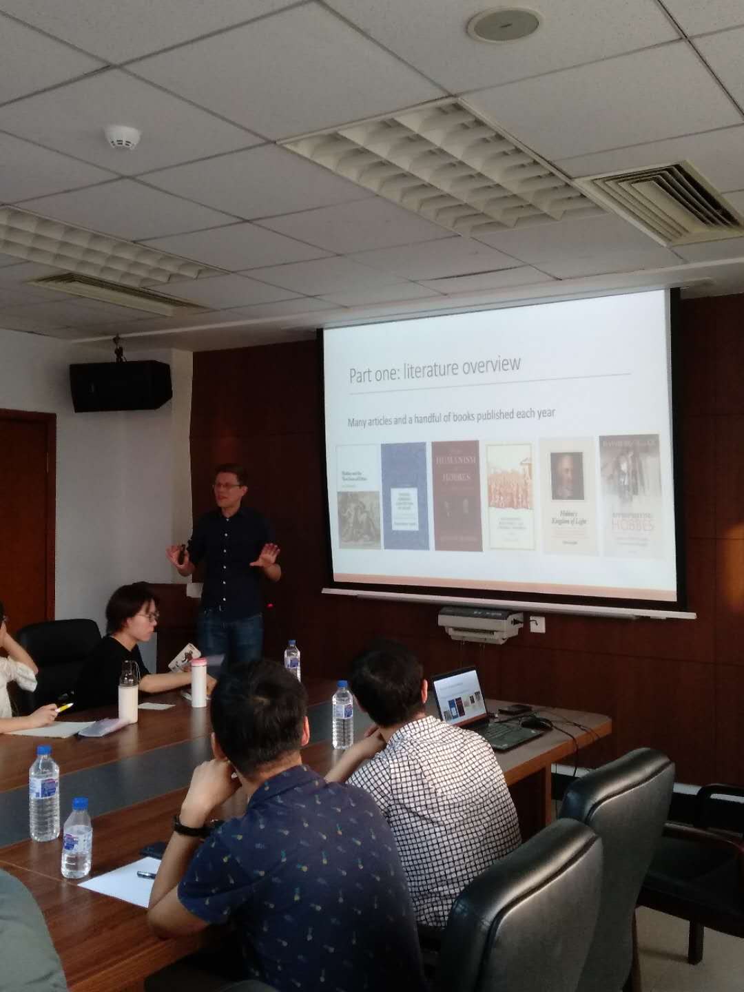 在讲座的第二部分,Johan向老师和同学们介绍了前沿的霍布斯研究信息。首先是暂未出全的牛津版霍布斯全集。该全集计划出版27卷,已出11卷,并且是原文与英译对照版。其次是较为权威的霍布斯研究的参考书,既包括综合性的,也包括主题性的。再次,Johan分门别类地介绍了发表霍布斯研究论文的期刊与杂志。最后,Johan介绍了两个重要的霍布斯学者协会:International Hobbes Association和European Hobbes Society。Johan重点介绍了后一个由他发起的协会。该协会成立于2011年,已经在五个国家的十一所大学中举办了十七次研讨会和两次大会。该协会也有自己的网站,包含了大量有益的霍布斯研究相关信息。