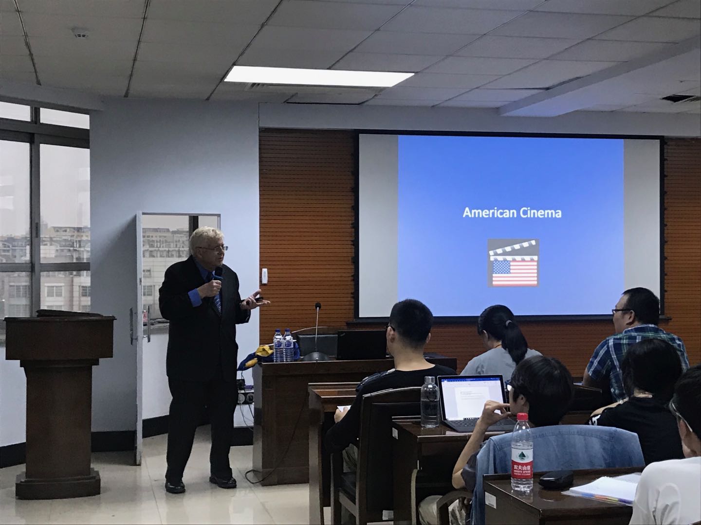 讲座期间,教授以专业的视角分析电影中的美国社会与文化。不同时期的电影是不同社会阶段的反映。在探讨好莱坞黄金时期时,Gillespie教授分析好莱坞电影成功的原因不仅仅在于电影主题清晰,更重要的是整部电影系统以线性的管理方法操作运行。一部经典的电影一定是与所处社会和所涉及阶层的处境相关。Gillespie教授根据不同的故事情节将电影划分为十种类型,并将每一种电影的特征与时代相联系。而在电影中反映的食物、建筑、服饰等符号也成为文化传播的手段。最后,教授以横店文化以及《战狼2》和《长城》这两部较为典型的电影为例,分析了中国电影市场的未来趋势。