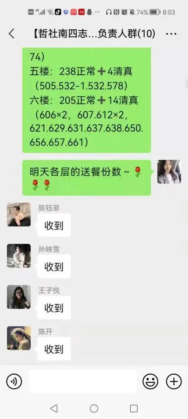 意识到情况的紧急,她立刻下床随意套件衣服后,便冲出屋子开始一间一间敲起学院寝室的门,把同学们喊醒后,她耐心说明情况、安抚大家忐忑的心理。在她和同学们的共同努力下,不到1小时的时间,南四便组建了150多人的哲社志愿者服务群。李慧婷也开始全面负责起了住在南四的19、20、21三个年级志愿者们的所有工作,扛起了这面大旗。“我们哲社巾帼,时刻准备出战”,她说。