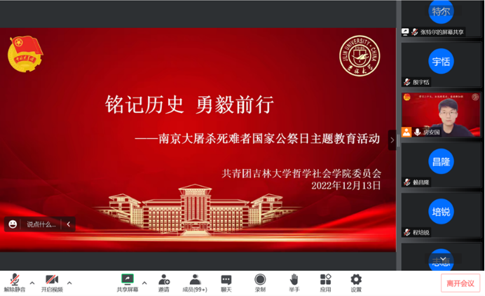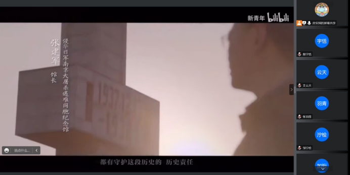 本次线上主题学习由房安国同学负责讲解。房安国同学从南京大屠杀的发生背景、事件经过、后续影响和教训启示四个方面向同学们详细地介绍这段中国人民的苦难历史。面对侵略者的暴行,勇敢顽强的中国人民没有选择屈服,而是在中国共产党的领导下英勇斗争,书写了一段万众一心、可歌可泣的民族抗战史。