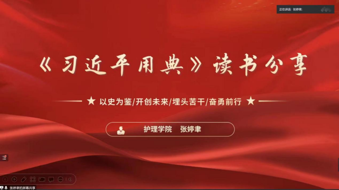 来自护理学院的张婷聿同学分享了《习近平用典》一书中与其最有渊源的《信念篇》。高三时的她偶然读到“志之所趋,无远勿届,穷山距海,不能限也。志之所向,无坚不入,锐兵精甲,不能御也”,这句话发张婷聿同学的思考。在深入阅读后,张婷聿同学分享了这句话对自己的启发与感悟:国家要有目标、人民要有目标、青年更要有目标。作为新时代的大学生,更应珍惜自己宝贵的青春年华,坚持理想,脚踏实地,将自己的人生深深扎根在祖国大地上。