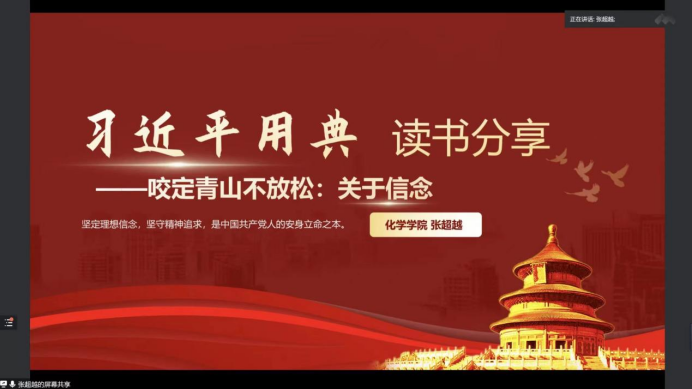 化学学院的张超越同学向与会同学们分享了自己对《习近平用典·信念篇》的阅读感悟。“志之所趋,无远勿届,穷山距海,不能限也。志之所向,无坚不入,锐兵精甲,不能御也”,这是人为什么要有理想信念的最好回复;“位卑未敢忘忧国”,这是人应树立起怎样的理想信念的最佳解答;“咬定青山不放松,立根原在破岩中。千磨万击还坚劲,任尔东西南北风”,这是人应怎样坚持理想信念的最优方案。