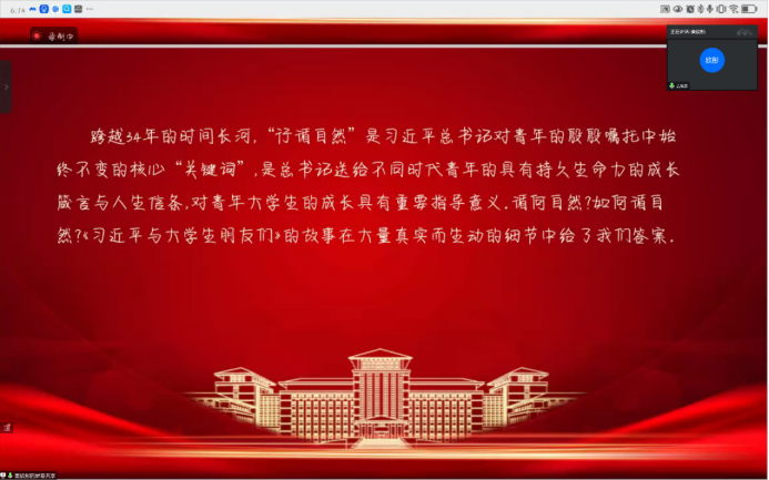 青马学员李子越同学以习总书记对青年的殷殷嘱托中始终不变的核心关键词“行循自然”为主题,她认为“行循自然”中的“自然”体现在人生的全过程,既是一种积极向上的人生哲学,也体现在生活的困境与逆境之中,是一种从容不迫的生活态度。我们青年要做到行循自然不仅要在汲取中华优秀传统文化与马克思主义科学理论中把握事物发展的自然规律,也要在基层的广阔天地中了解事物发展的自然状态,更要在与逆境、困难的搏击中涵养从容不迫的人生态度,为祖国、为人民、为民族、为人类的奉献中彰显青春力量。