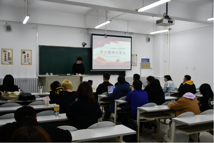 团委新时代理论宣讲团在第三教学楼105教室召开了两会精神主题学习分享会。本次分享会由团委新时代理论宣讲团负责人郭毅同学担任主持人,21级、22级各团支部团员参加。