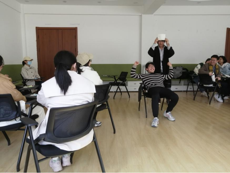 首先进行的是“放松”环节。在准备好的纸片上写上自己今天在活动中的名字并将其放在身上明显的位置上。可以在名字之后加一个自己的兴趣爱好,然后以引导者开始,首先介绍自己的名字,示范一个当下自己最想要做的放松动作,在场所有人一齐喊出示范者的名字,跟着做该示范动作。顺时针旋转让在场的每个人都示范一次,复习记忆。在朋辈学生心理辅导员引导下,让参与者放松身体,同时兴奋状态。