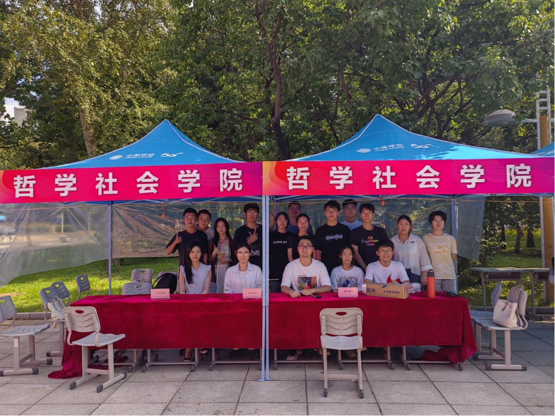 的迎新报到工作场地,对桌椅进行摆放,同时将部分迎新物资布置到位。在场地上,宋老师和同学们认真调试了人脸识别设备和电源储备保障情况,反复演练新生报到流程,通过预报到演习尽力确保明日正式迎新顺利进行。师生们在一起互相鼓励、互相打趣,欢声笑语在五月花广场的上空飘扬。