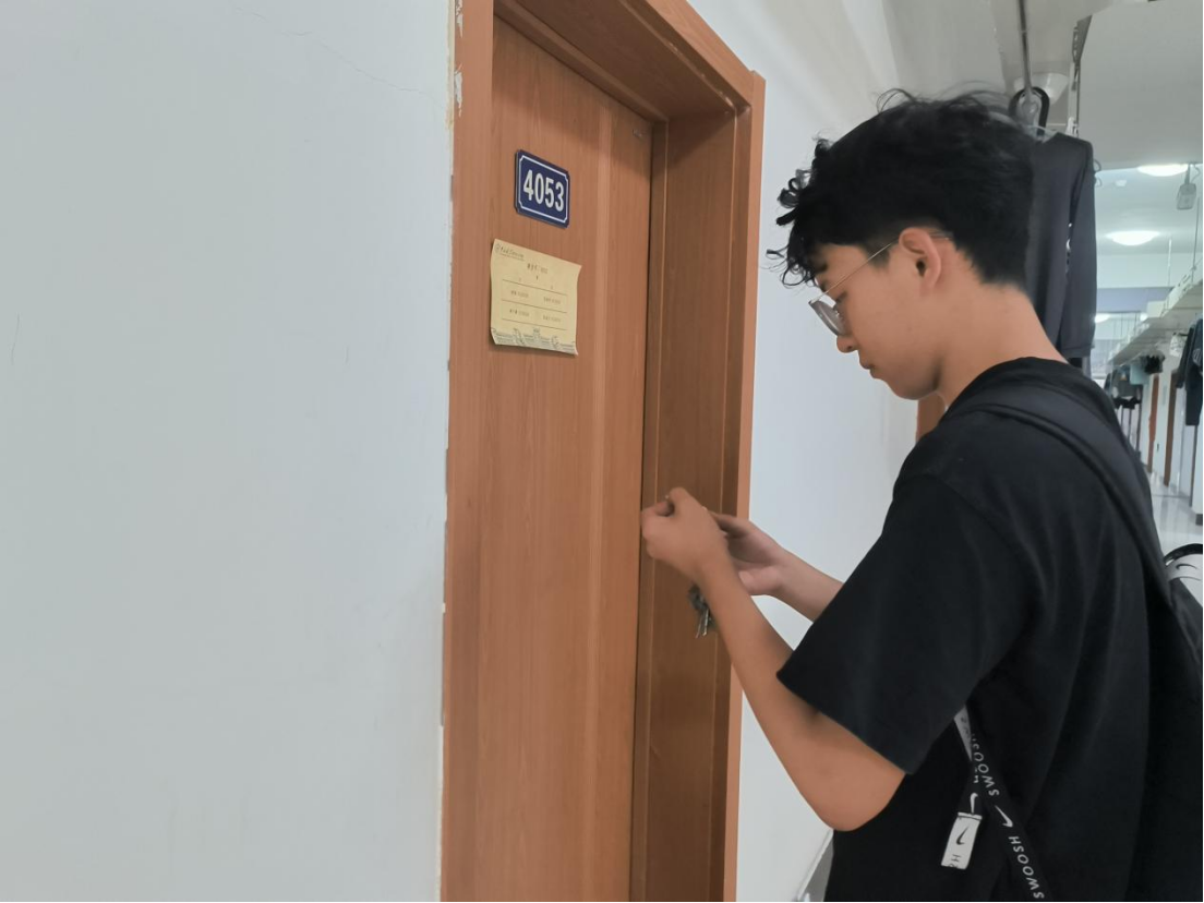 经过短暂的休整,宋老师和同学们来到宿舍了解新同学们的住宿情况。老师和同学们将早早设计好的学院标识和学生住宿标识认真张贴,仔细检查了寝室硬件设施,发现问题向宿舍管理人员及时求助解决。同时,师生们利用已有的清扫工具对新同学们的宿舍进行了打扫整理,为新同学营造卫生干净的住宿环境。