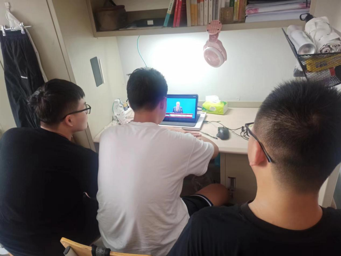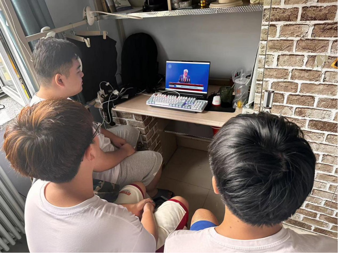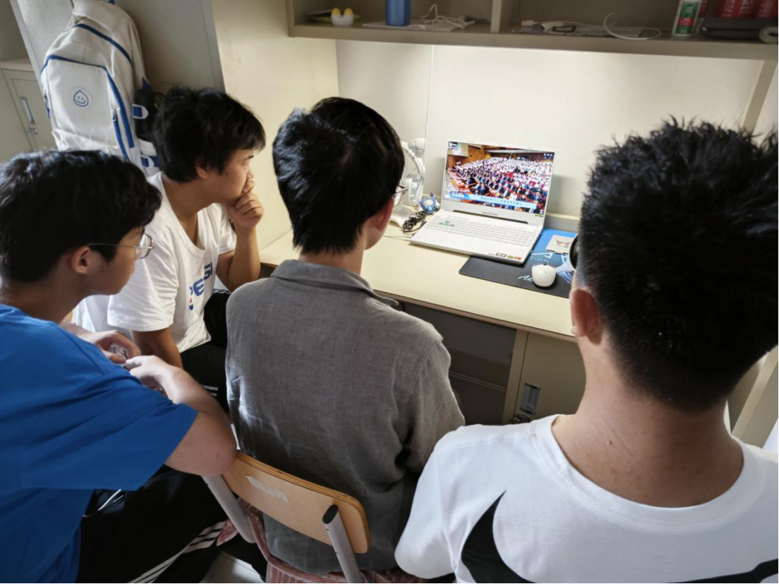 学子面貌昂扬、精神集中,在屏幕前认真观看现场直播。