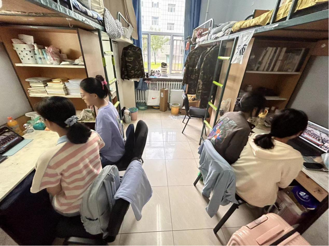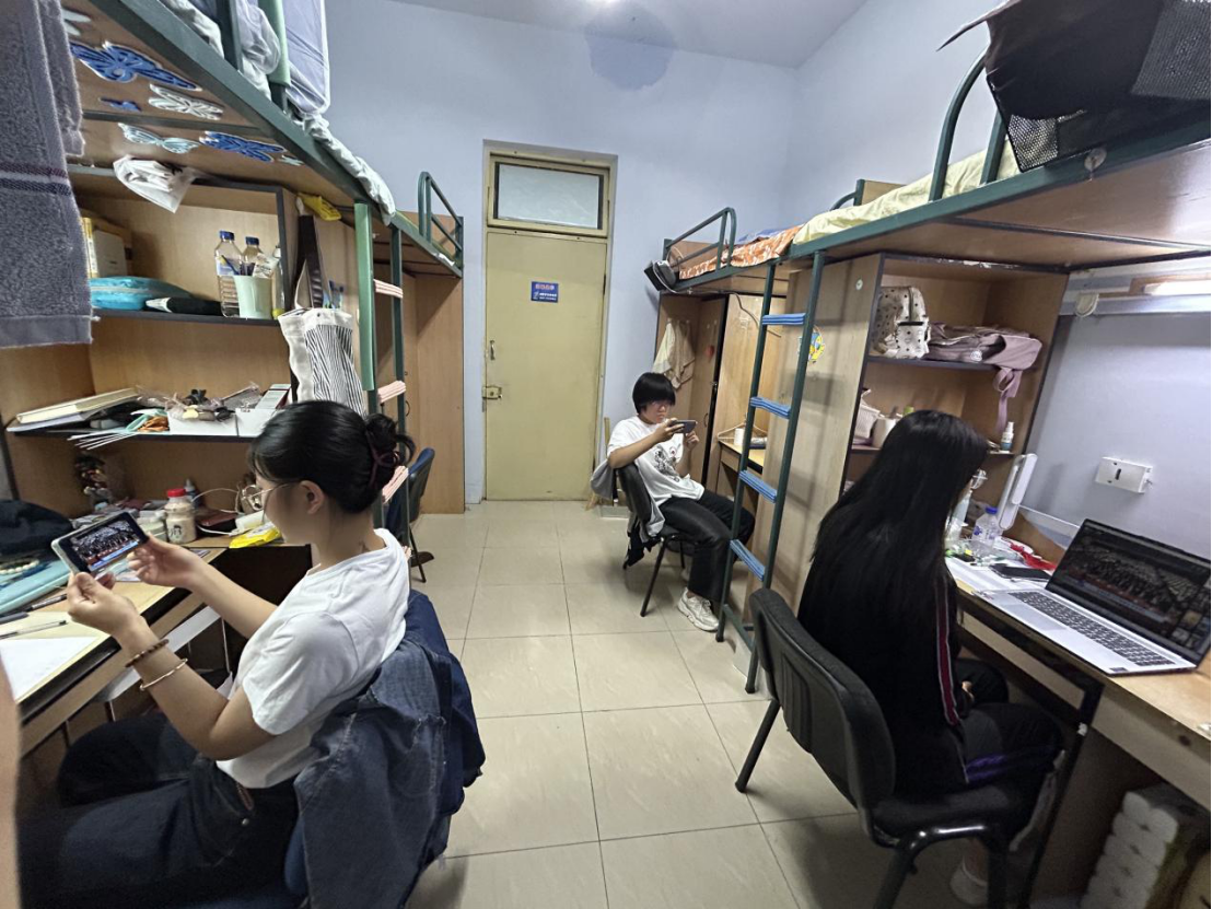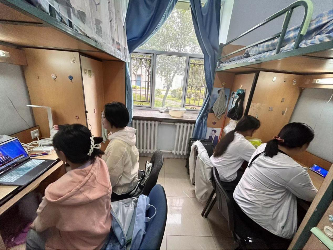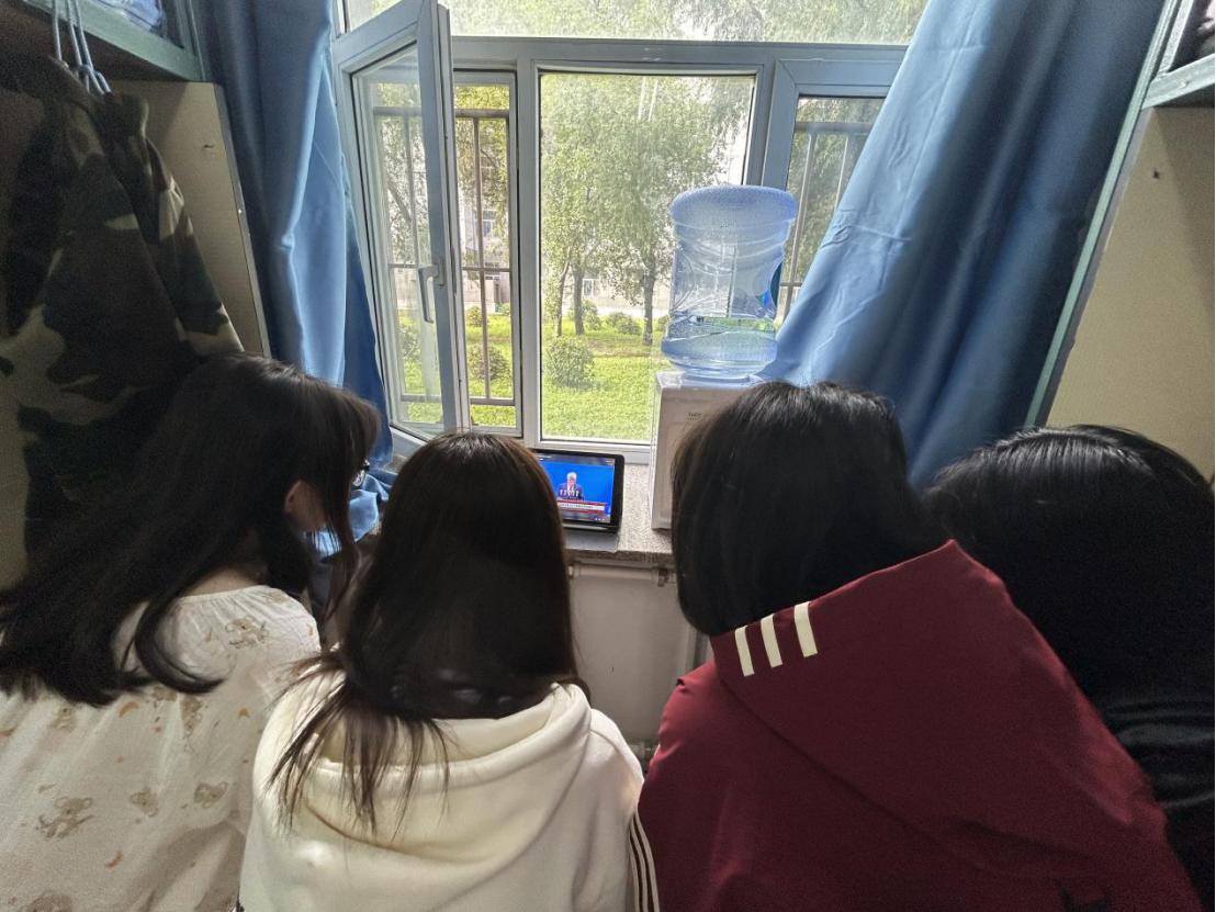学子面貌昂扬、精神集中,在屏幕前认真观看现场直播。