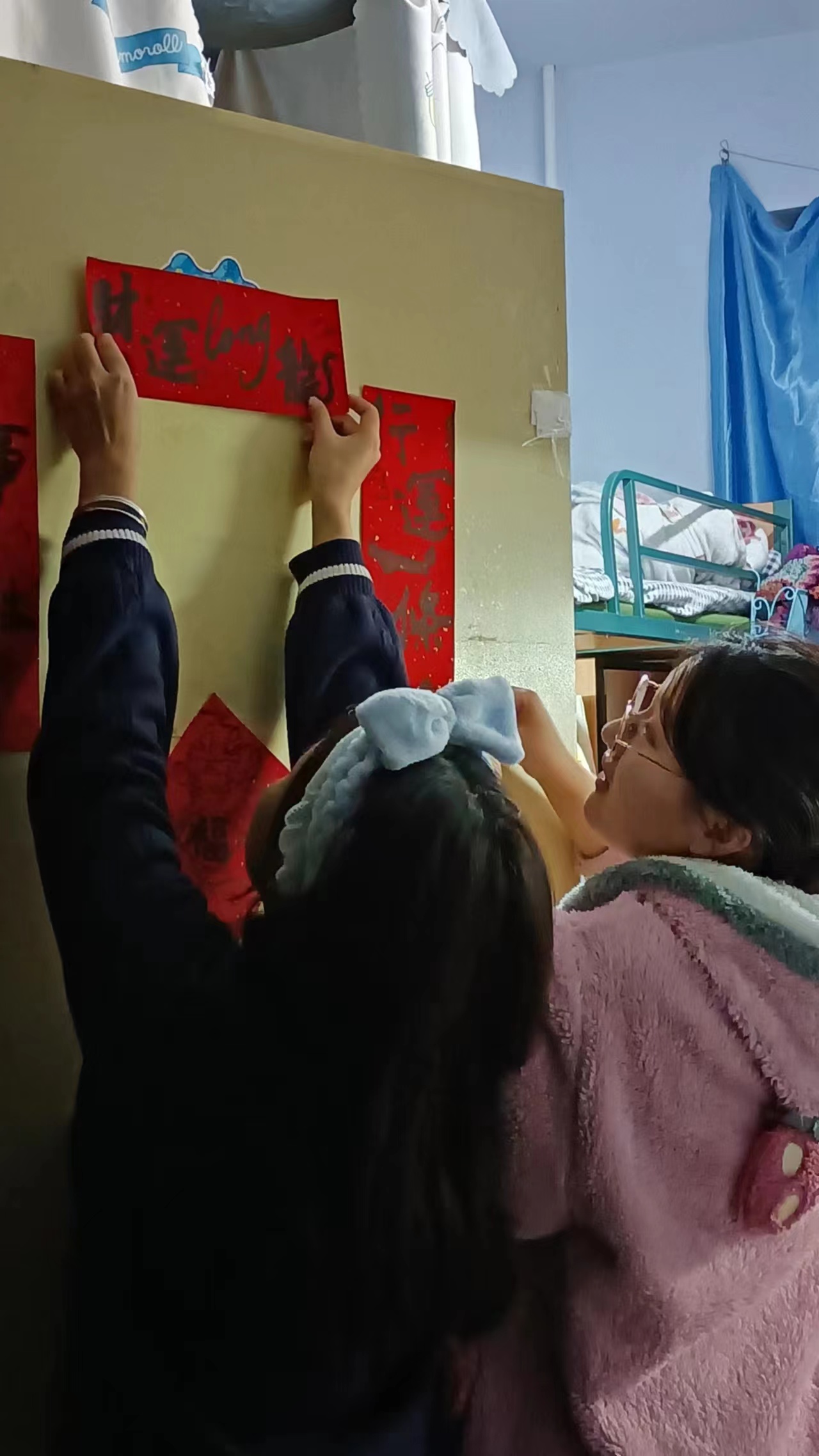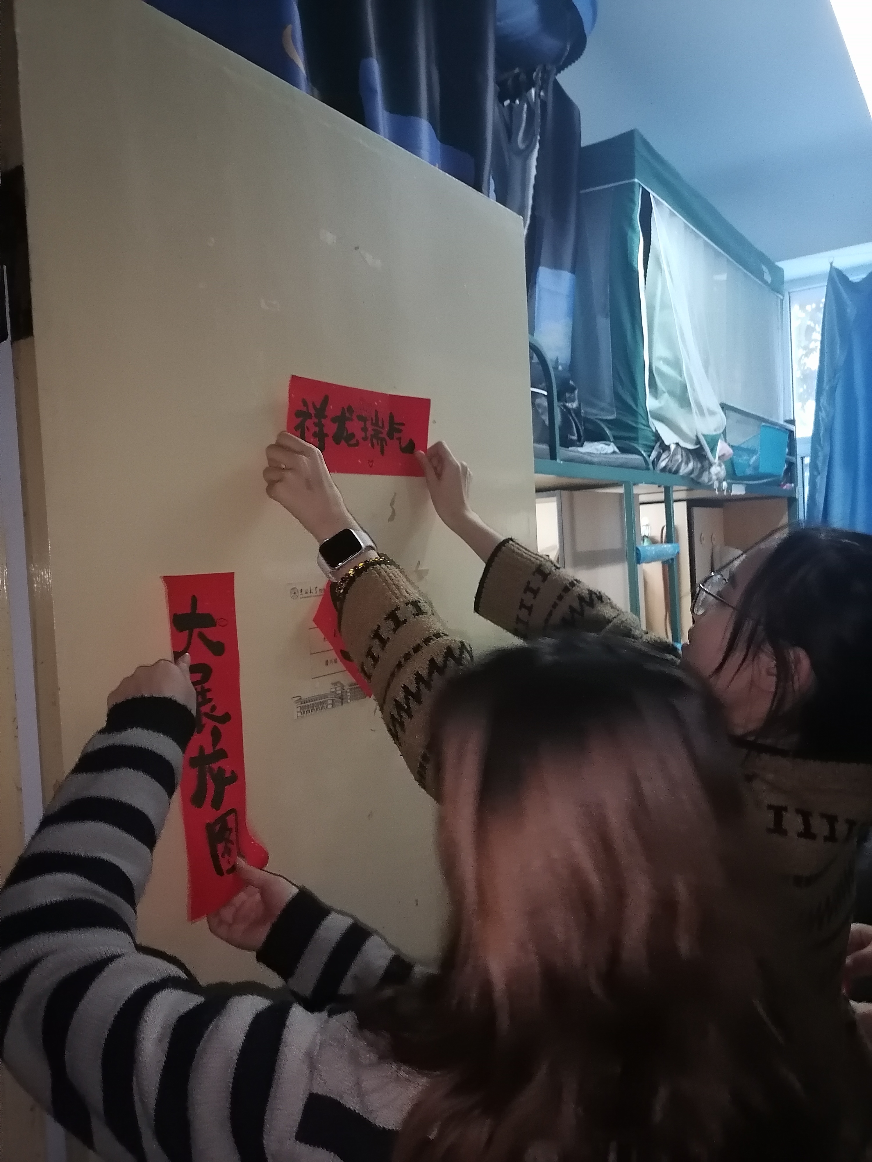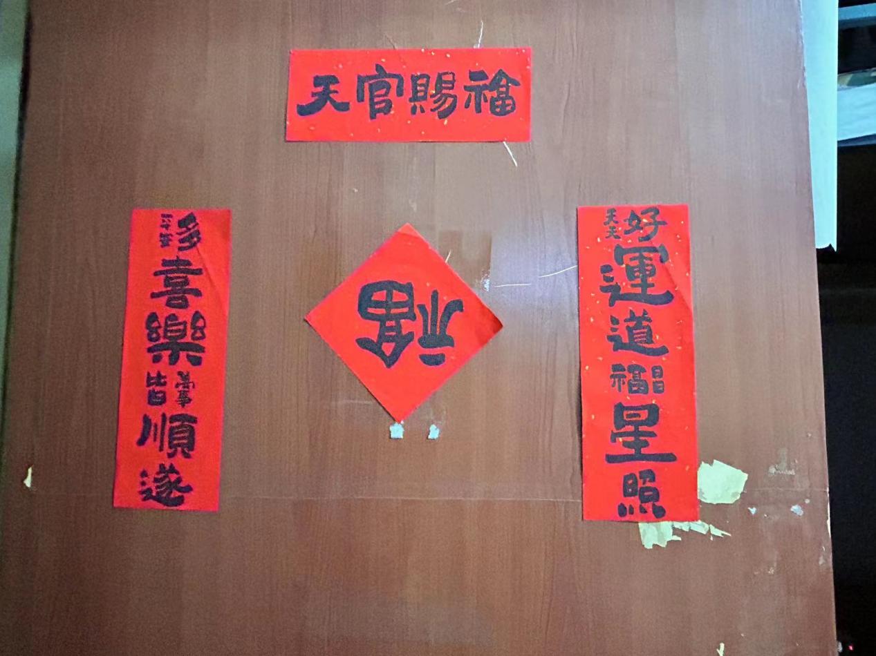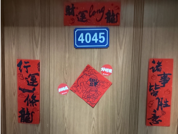 学生会和生活管理委员会提前购置了具有“龙”年特色的对联、福字,在各位老师的带领下,同学们纷纷动手贴上寓意着幸福美好的春联。一个个“福”字和拥有美好寓意的春联整齐地挂在门前,寝室走廊被浓郁的节日气息和喜庆的红色铺盖,浓浓的年味扑面而来。