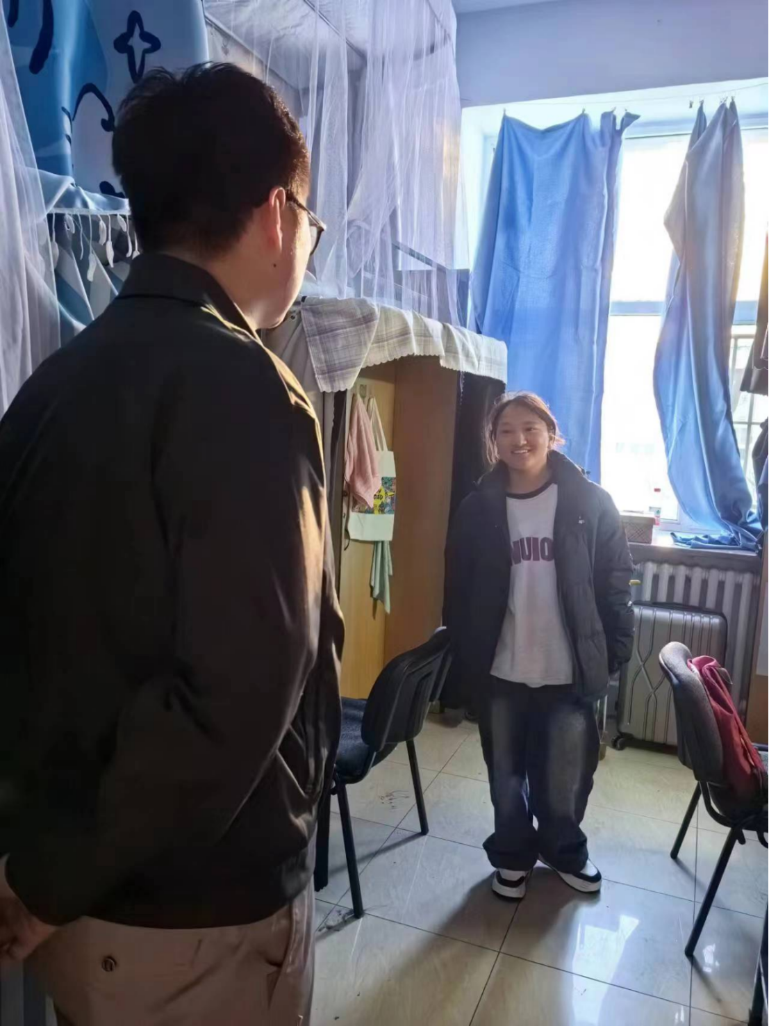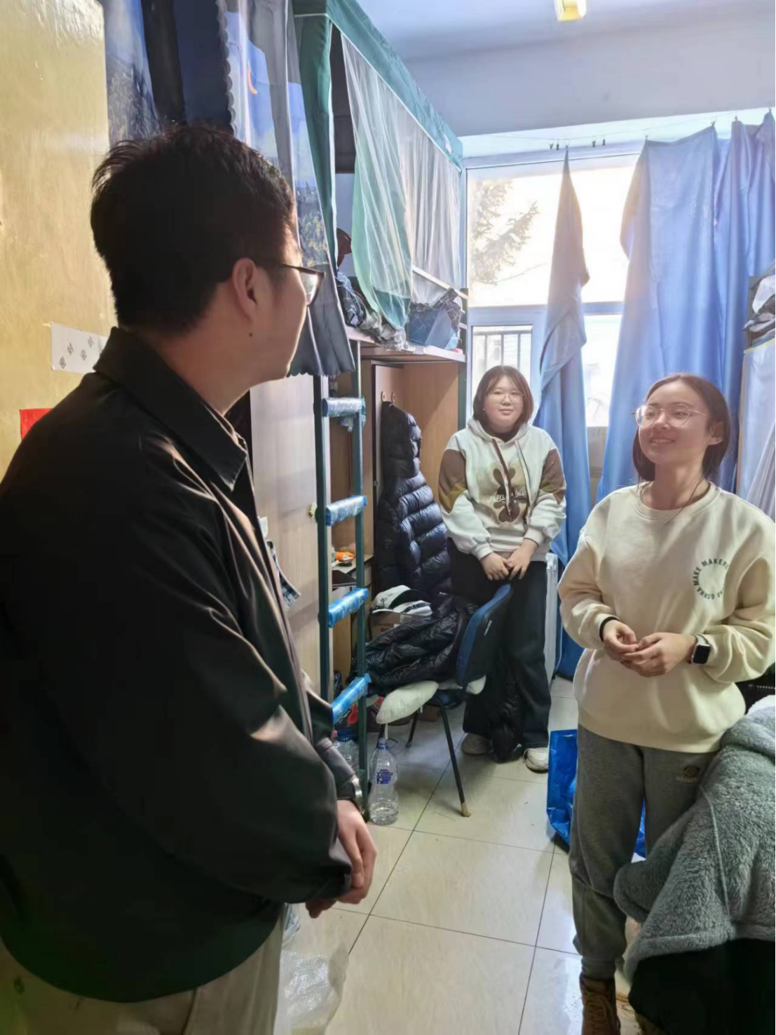 针对走访寝室的卫生情况,宋老师和师兄师姐们提出整理建议,春季流感频发,宋老师提醒同学们关注寝室卫生和个人身体健康,做到宿舍勤打扫勤通风,营造干净整洁、团结和谐的良好氛围。
