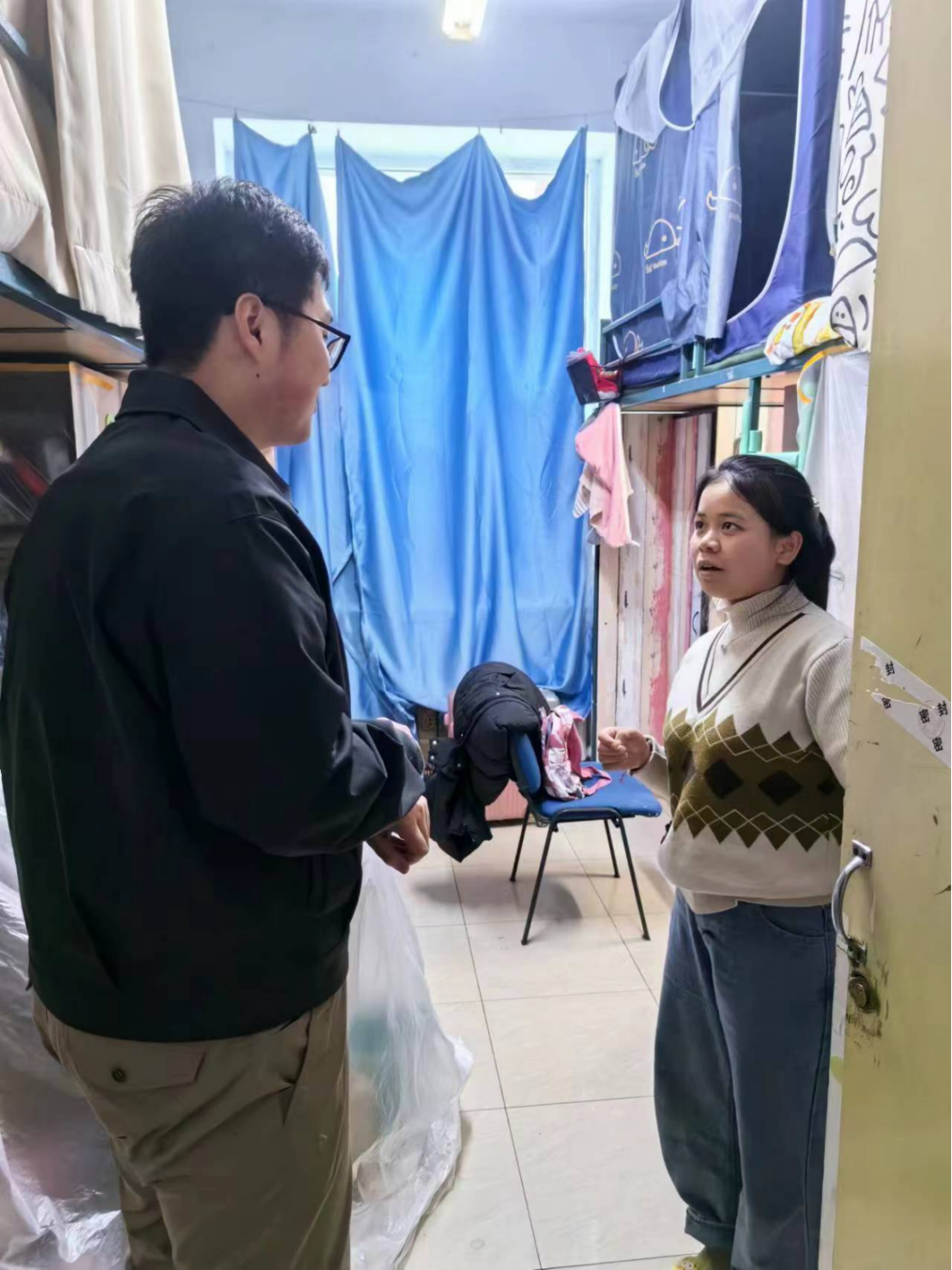 通过此前数据统计排查,宋老师来到因暂时没有抢到票尚未返校同学寝室,对其物品进行查看归纳,电话提醒其不要担心,并引导室友间及时交流学习内容和课堂记录,避免耽误课业进度。