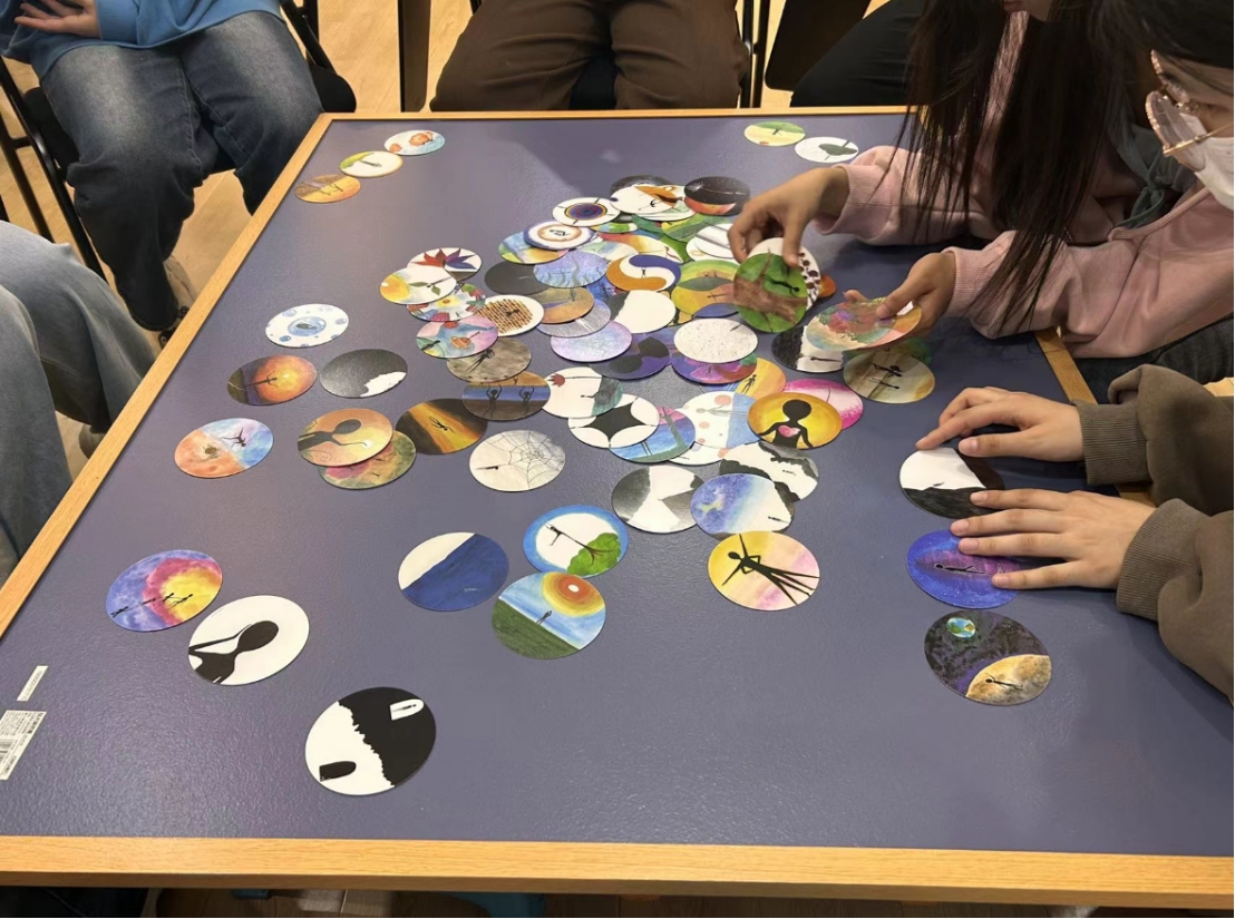 在轻松愉悦的氛围中,同学们逐渐放下了初次见面的拘谨,共同完成了第一个破冰环节:每个人选择三张因纽特卡片,分别代表自己的过去、现在和未来,并以此向大家介绍自己。这个独特的开场方式让大家能够直观地看到自己人生的不同阶段,并通过卡片上的图案和文字,分享了自己的故事和感受。同学们在舒缓地音乐中开始走近自己的心灵、走向通往彼此的桥梁。