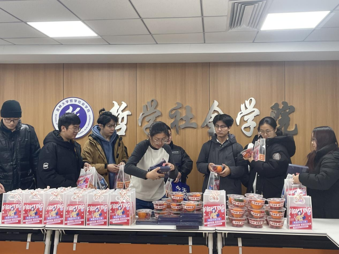 在学生活动室,老师们热情地为同学们分发学院学工办提前设计定制的“金榜题名”考研礼包,贴近生活需要的物资、零食一应俱全,同学们在“开箱”后欣喜满满,纷纷拍照分享,欢声笑语中紧张的复习压力也渐渐消散。