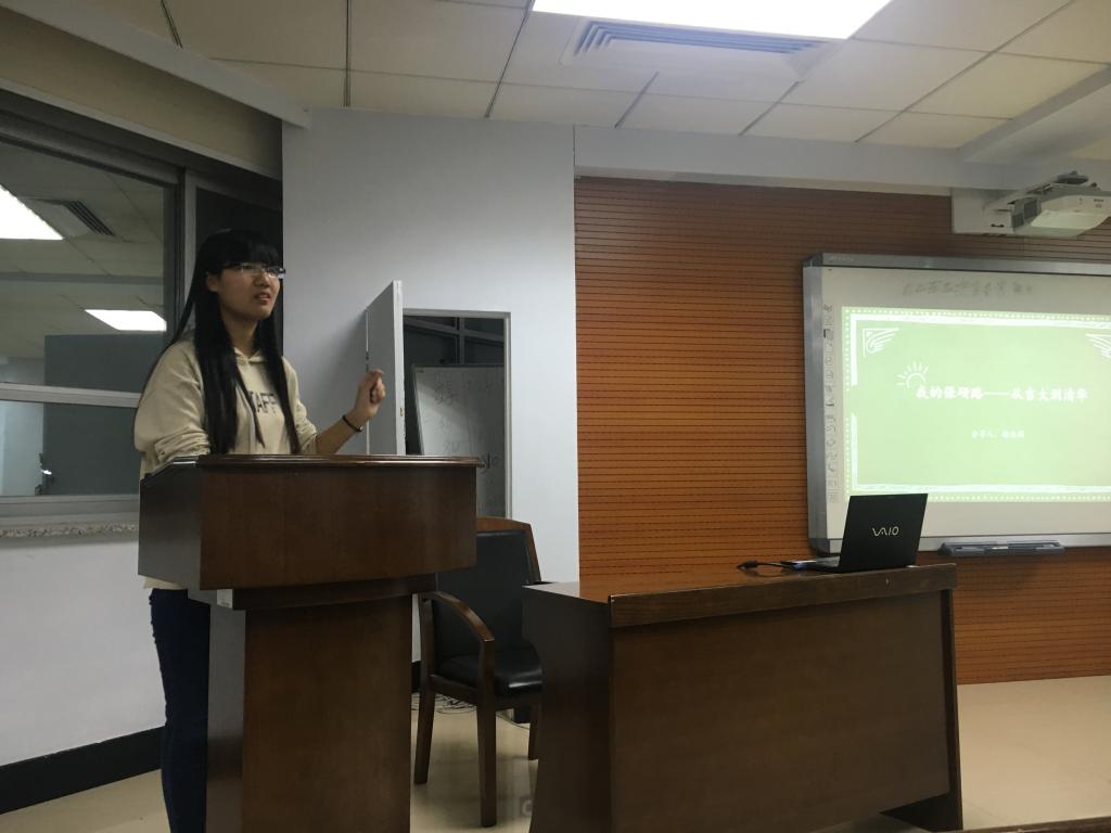 接着,郝亚辉同学与师弟师妹们分享了她的保研经历——从吉大到清华。她从申请保研时填写的资料出发,讲述了保研路上需要积累的素养。作为学生,学术研究经历必不可少,社会实践经历也有裨益。她用切身经验分享了一路走来的心路历程,并告诫师弟师妹们无论何时,谨记“真诚”。语言平实,干货满满,师弟师妹们受益良多。
