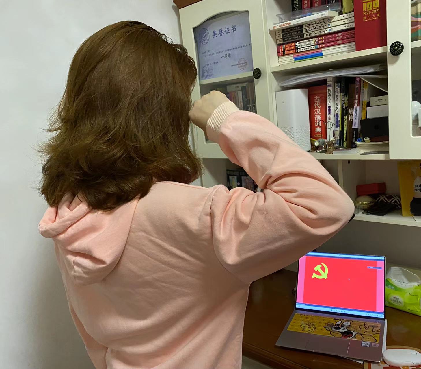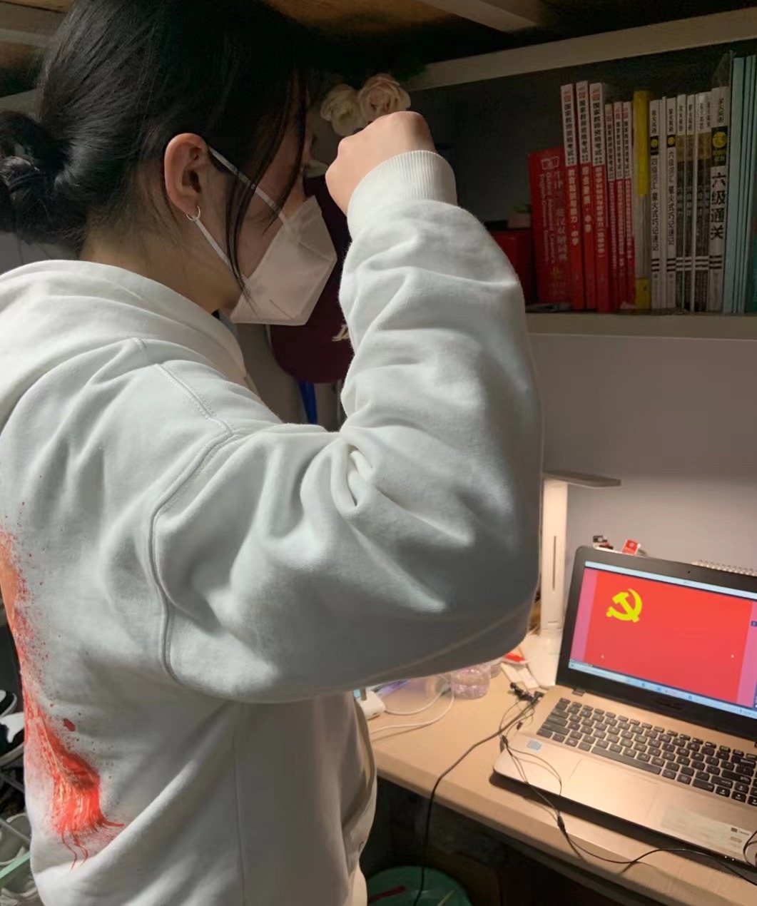第二部分主题为“践行使命,不负初心”。首先,由20级本科生李慧婷同志作了吉大哲社师生和党员的抗疫事迹宣讲。李慧婷在发言中表达了对所有参与志愿服务的哲社志愿者、医护人员以及宿舍阿姨的感谢,接着李慧婷提到抗疫工作尚未结束,这场没有硝烟的战争也还在继续。她会尽自己的全力带领我们哲社最美志愿者团队,在为南四公寓同学们服务的征途上继续奋斗。然后,由18级本科生林之乐同志带领第二党支部全体党员重温入党誓词,在那一声声中“我志愿加入中国共产党”的铮言中,每一位党员都热情似火,眼神坚定,声声誓言传递着必然战胜疫情的决心。