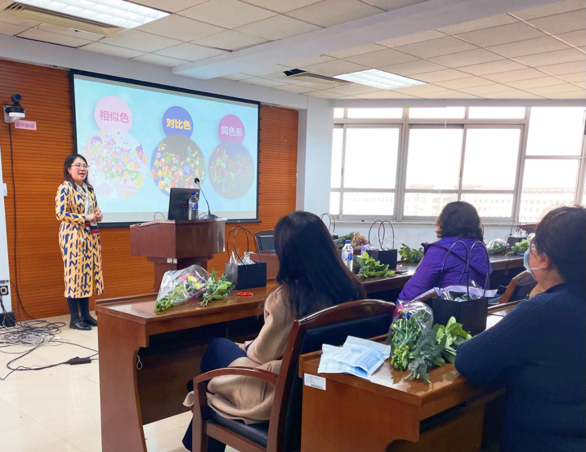 国家级插花培训师、长春市现代女性大讲堂特聘花艺培训师、“幸福家庭360”公益大讲堂专家、中国插花花艺协会会员刘春博老师为老师们进行了专题花艺讲解。刘老师从我们熟知的影视作品中的插花艺术开始,系统地讲解了我国插花艺术的起源和发展历史,并对东方、西方、现代自由式插花进行比较,介绍了艺术色彩搭配、插花造型以及各个花材所代表的花语,内容精彩,引人入胜。