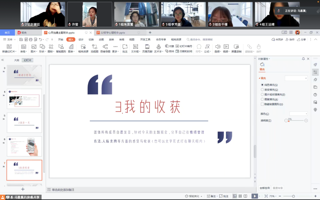 主持人鼓励同学们表达各自的感受,在活动的逐步递进中,大家释放自己的情绪,达到缓解压力的目的。