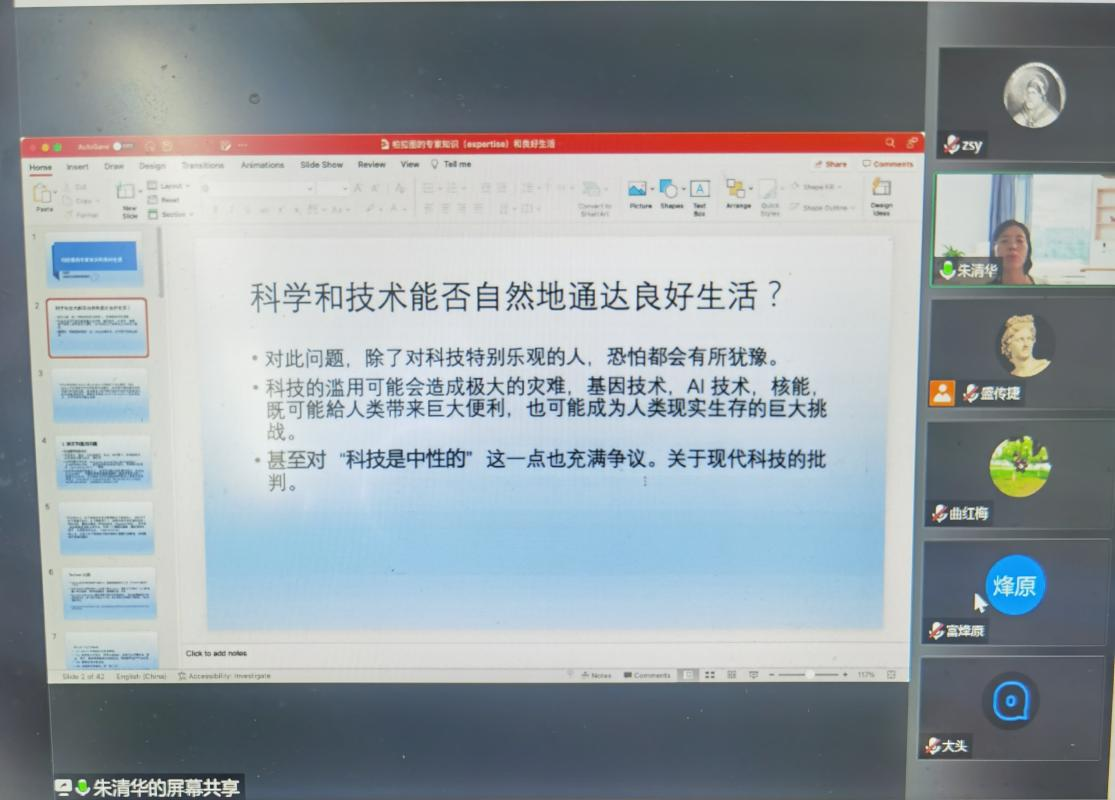 讲座伊始,朱清华教授从本次讲座的问题起源:科学和技术能否自然地通达良好生活入手,指出现代科技一方面可能带来很多生存便利,但另一方面也可能成为人类生存的巨大挑战,她以海德格尔的“座驾”(Gestell)概念举例,说明现代人的生存受到了科技的摆布。而柏拉图的“专家知识”(expertise)就是此问题的一种古代版本。在柏拉图关于技艺(technē)和知识(epistemē)的描述中可以看到,技艺可以推进好生活是毫无疑问的。
