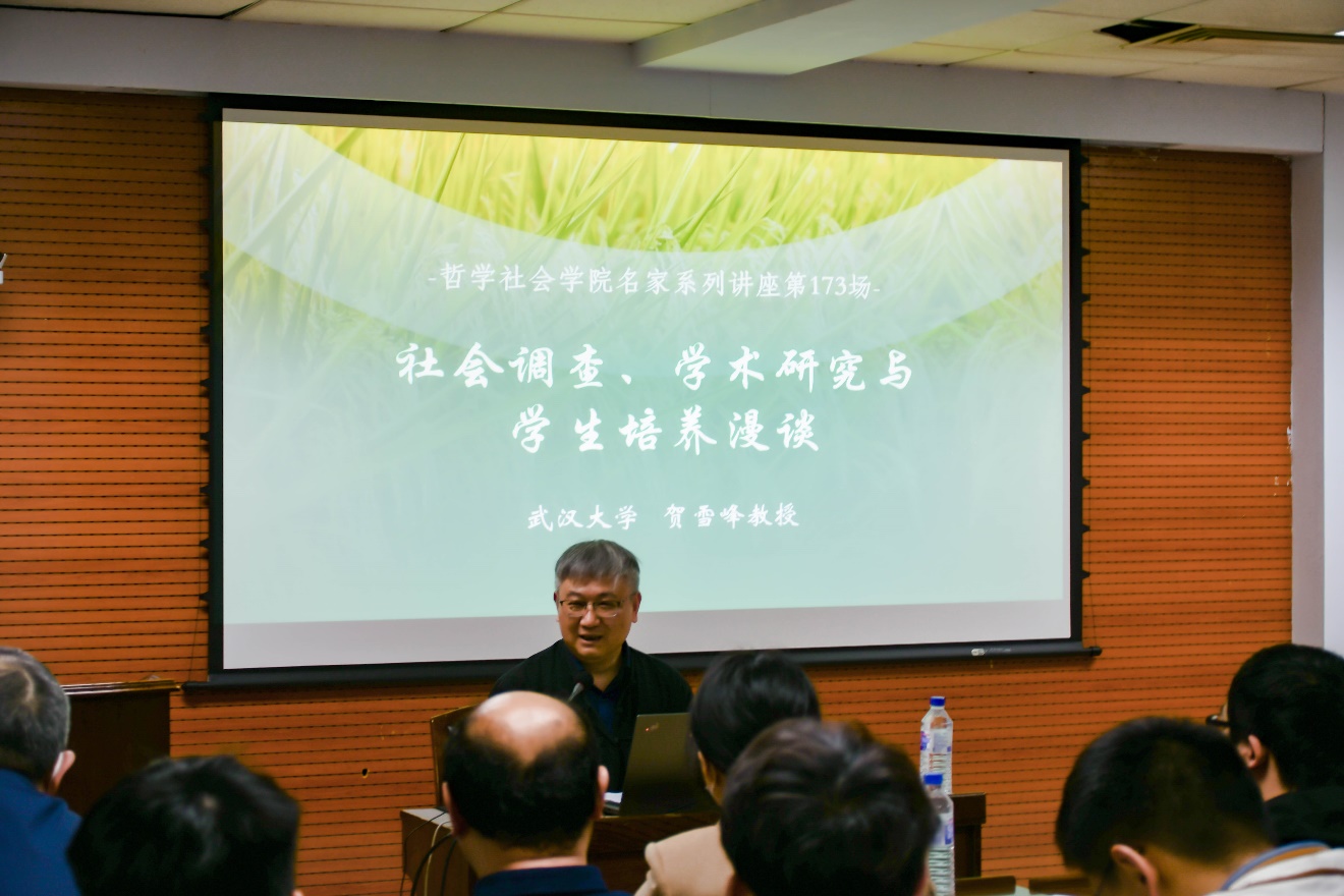 讲座伊始,贺教授首先提出了做社会调查与学术研究的前提基础是“读硬书,硬读书”。他结合个人的学术成长经历认为学生们通过阅读经典著作,能够有效锻炼提升思辨能力,并根据其多年组织读书会的经验,建议专业基础理论书籍的阅读量达到130余本。同时,贺教授也非常重视学生的体育锻炼,强调健康强健的身体是做好学术的本钱。