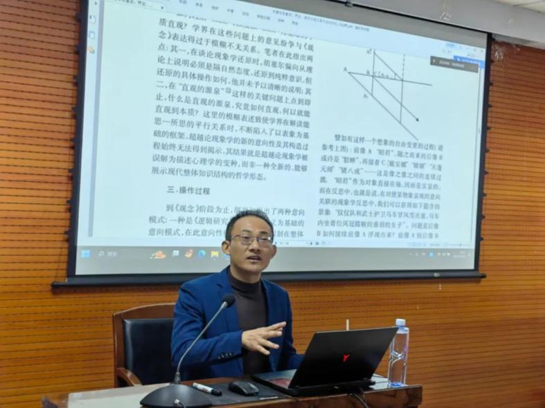马迎辉老师首先通过“范畴直观”引入讲座主题。他指出普遍直观和范畴直观建立在整体与部分的关系之上,本质直观才是纯粹形式范畴的真正体现,向本质直观的突进体现了现象学从描述心理学向超越论现象学的突破。讲座内容分为四个部分:一、《逻辑研究》当中的范畴直观;二、本质直观的提出;三、本质直观的结构或操作过程;四、结语。