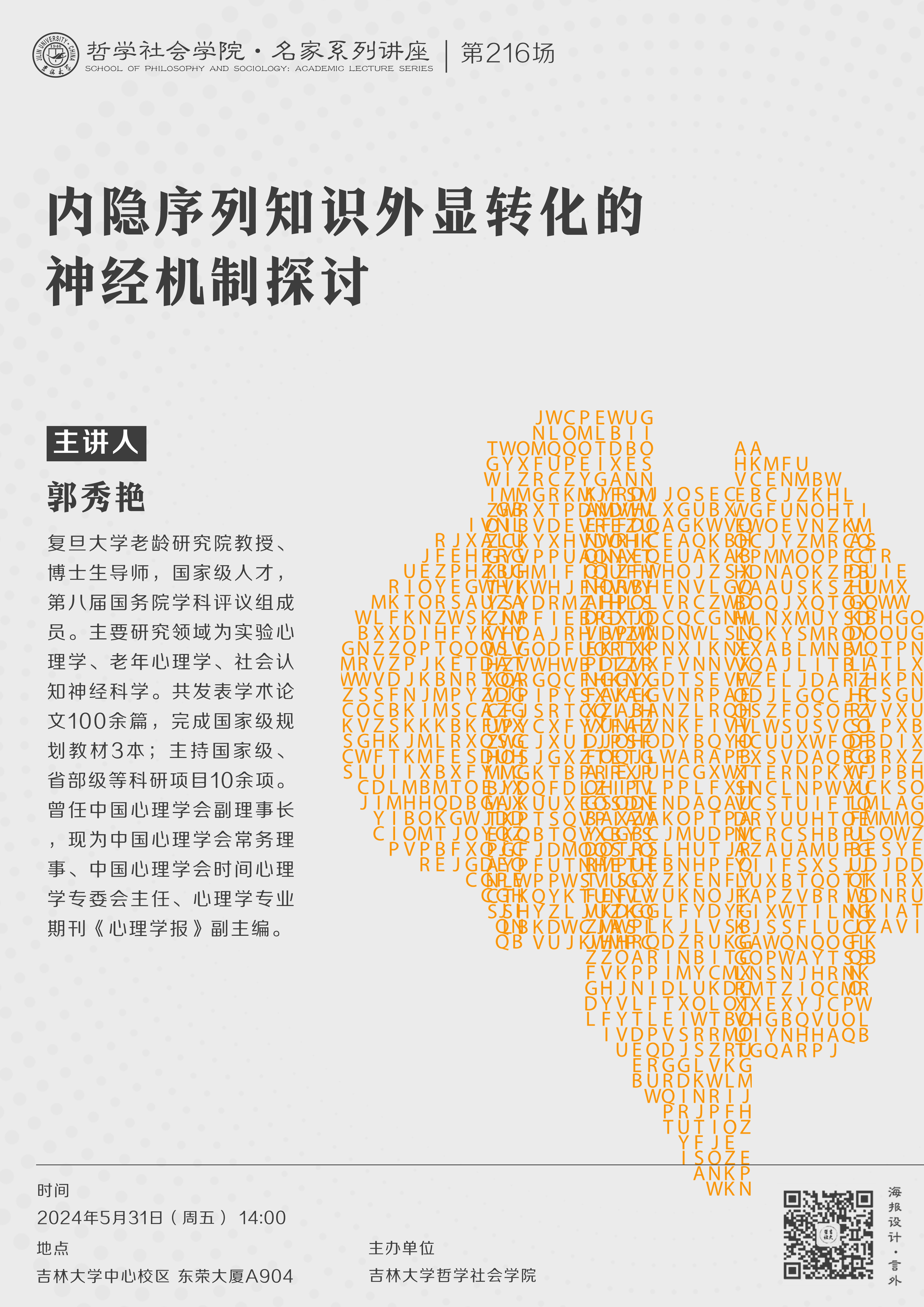 名家系列讲座第216场于吉大中心校区东荣大厦904举办。讲座由复旦大学老龄研究院教授郭秀艳主讲,题目为“内隐序列知识外显转化的神经机制探讨”。91av