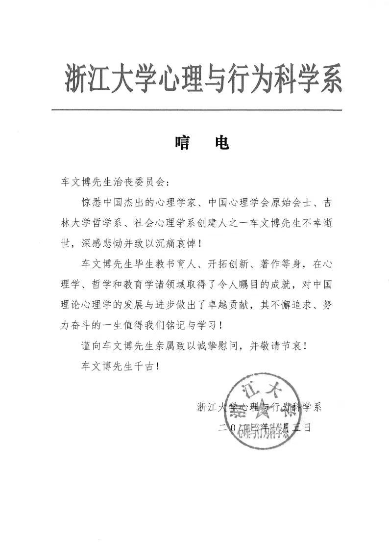 浙江大学心理与行为科学系唁电